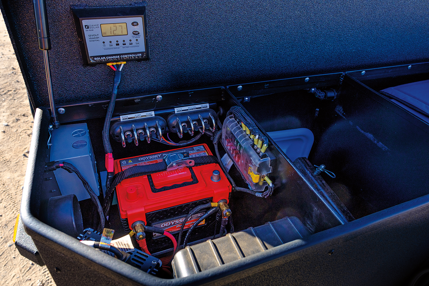 The electrical system has also had a major overhaul. Gone are the Goal Zero Yetis and daisy-chained cables. They’ve been replaced with dual Odyssey batteries and a Zamp solar controller which provide a much more efficient and effective source of power in camp.