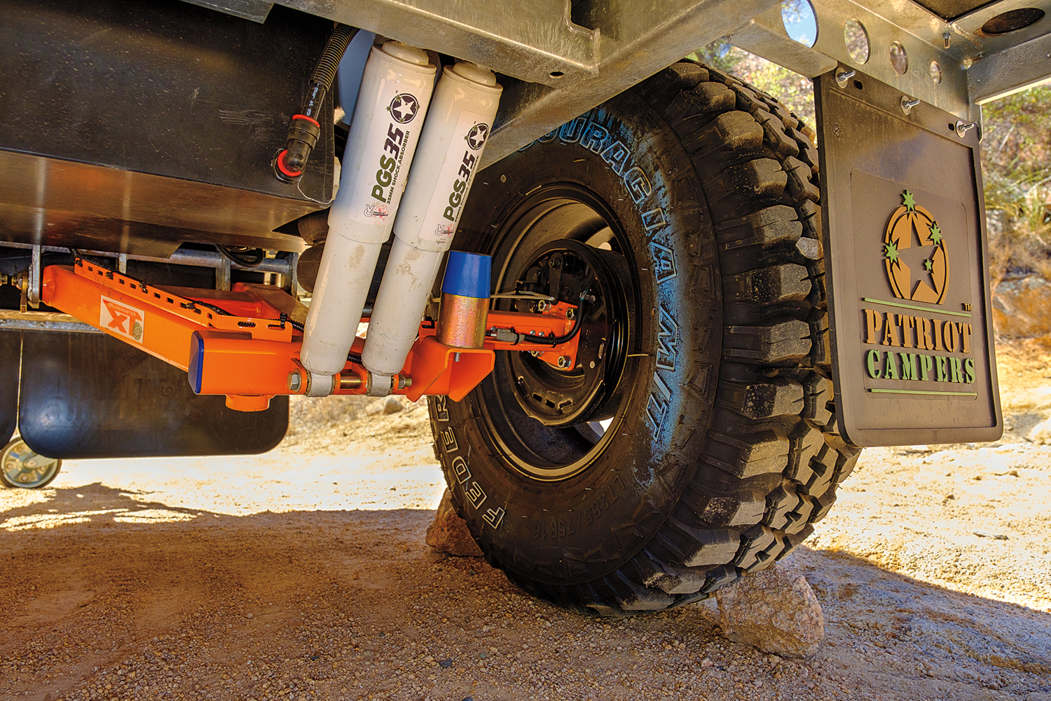 In the backcountry, the Patriot is at home; it effortlessly completed all of our trail tests and asked for more. What made the X1 stand out was its performance in both the technical loop and on the open, corrugated fire roads. In challenging terrain, the compact dimensions, modest weight, and generous ground clearance allowed us to push the limits of approach, departure, and side slope capability. The only unprotected body panels are the replaceable corner bottle trays. The unique DO35 coupler allows for full off-highway angles in uneven terrain, but it is also easy to attach with a self-centering pin. For the dirt roads, the plush suspension soaked up everything the Toyota did and showed no sign of bottoming or topping out over wallows and berms. It was settled and confidence inspiring, exactly how a suspension should perform in those conditions.