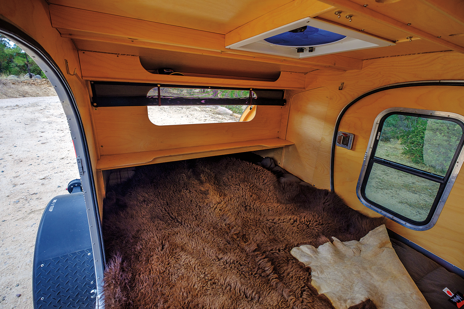 Of course, this intentional reduction in amenities doesn’t mean the trailer is uncomfortable. Our test unit came equipped with a solar-heated road shower for rinsing off and an ARB awning for shade from the scorching sun. Inside, you’ll find a queen-size memory foam mattress to sprawl out on and small storage shelves for your book, glasses, and other treasures. LED lights sip power from a portable Goal Zero power source in the rear of the trailer, which can also power most of your devices, although it must be moved into the vehicle for charging.