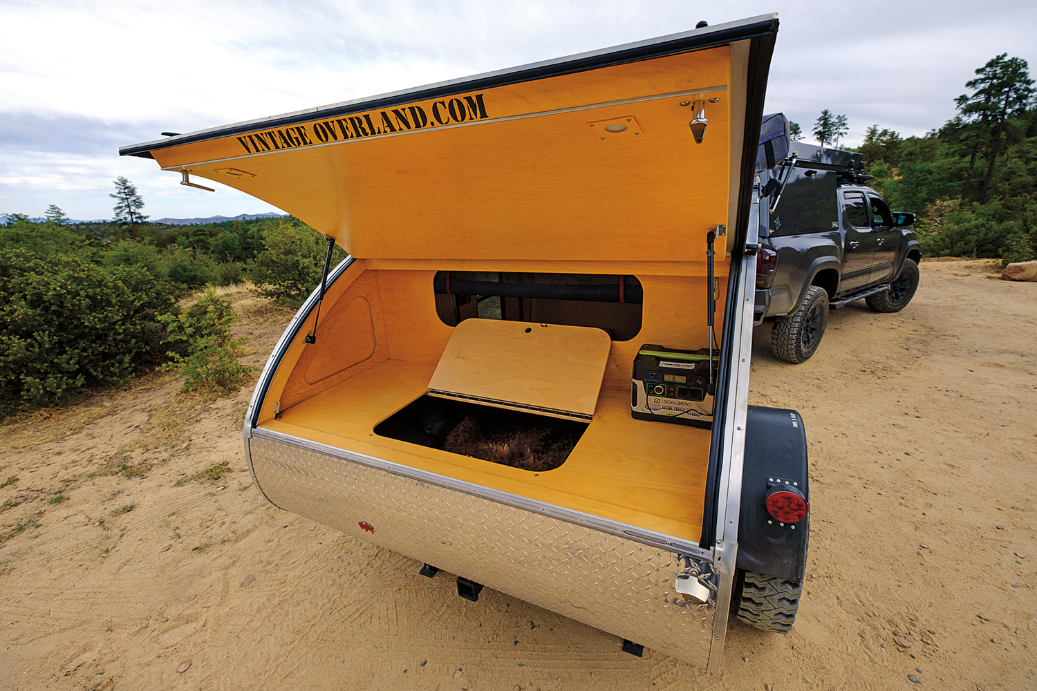 On the road, the T.E. Lawrence (aka Lawrence of Arabia) is a pleasure to pull; its 1,180-pound curb weight hardly noticeable behind the Tacoma or G-Wagen. The shape is also slippery to the wind and makes a noticeable improvement to fuel economy over more boxy trailers. With the wider track and stiff Dexter torsion axle, the trailer handled well, although it was a bit busy over rough pavement. The lightweight and negligible suspension travel encourage any abrupt bump or wallow to send the trailer airborne (though not very high). When towing on steep mountain roads, I noticed the lack of brakes; they are a strong recommendation for any trailer that is more than 1,000 pounds, particularly when towed by a vehicle that is already approaching GVWR. Road trips with the Vintage Overland are fun, as almost every vehicle that passes gives a wave, thumbs-up, or points a camera (or cell phone) at it out the window.