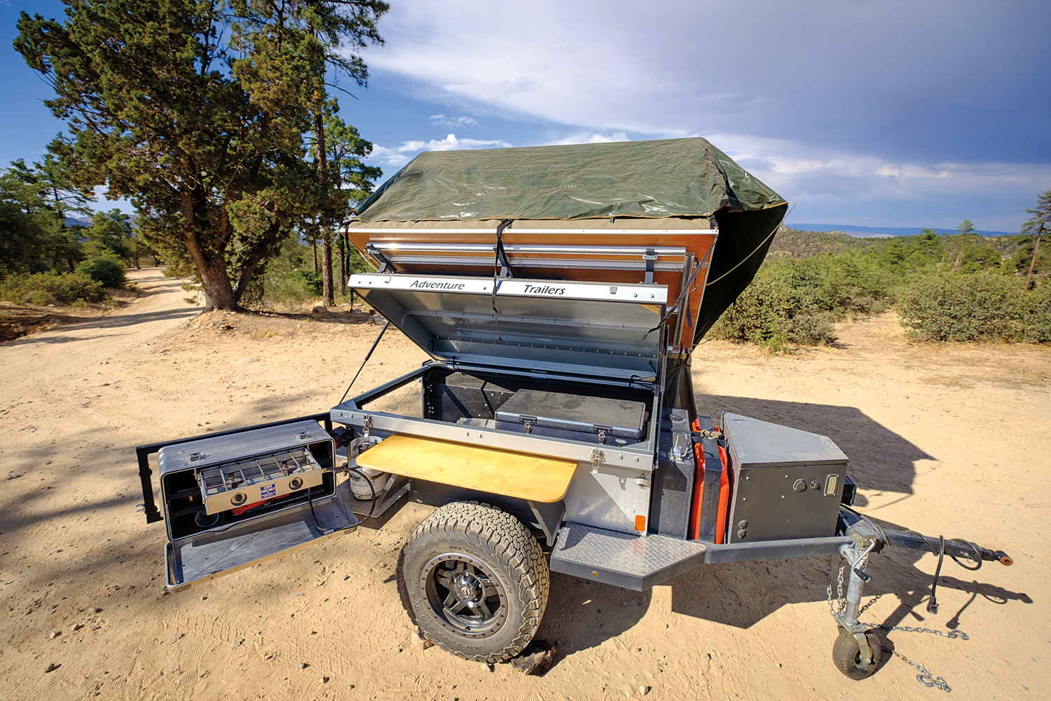 When it comes to camp systems, AT Overland has always gone for the proven and reliable options, and the Chaser is no exception. There is a 19-gallon water tank located on the tongue that uses a manual pump, and two jerry cans for extra fuel or additional water. The table is truly minimalist: a piece of wood that wedges into the fender. In the tongue box, a single- or dual battery system can be installed with a solar controller and charging ports for devices. And, if you want to get fancy, a swing-out kitchen can be added to the tailgate which includes a Partner Steel stove. Its brief list of features might seem underwhelming, but what it equates to is an uncomplicated camp experience with a lot of reliability and little fuss—we love it.