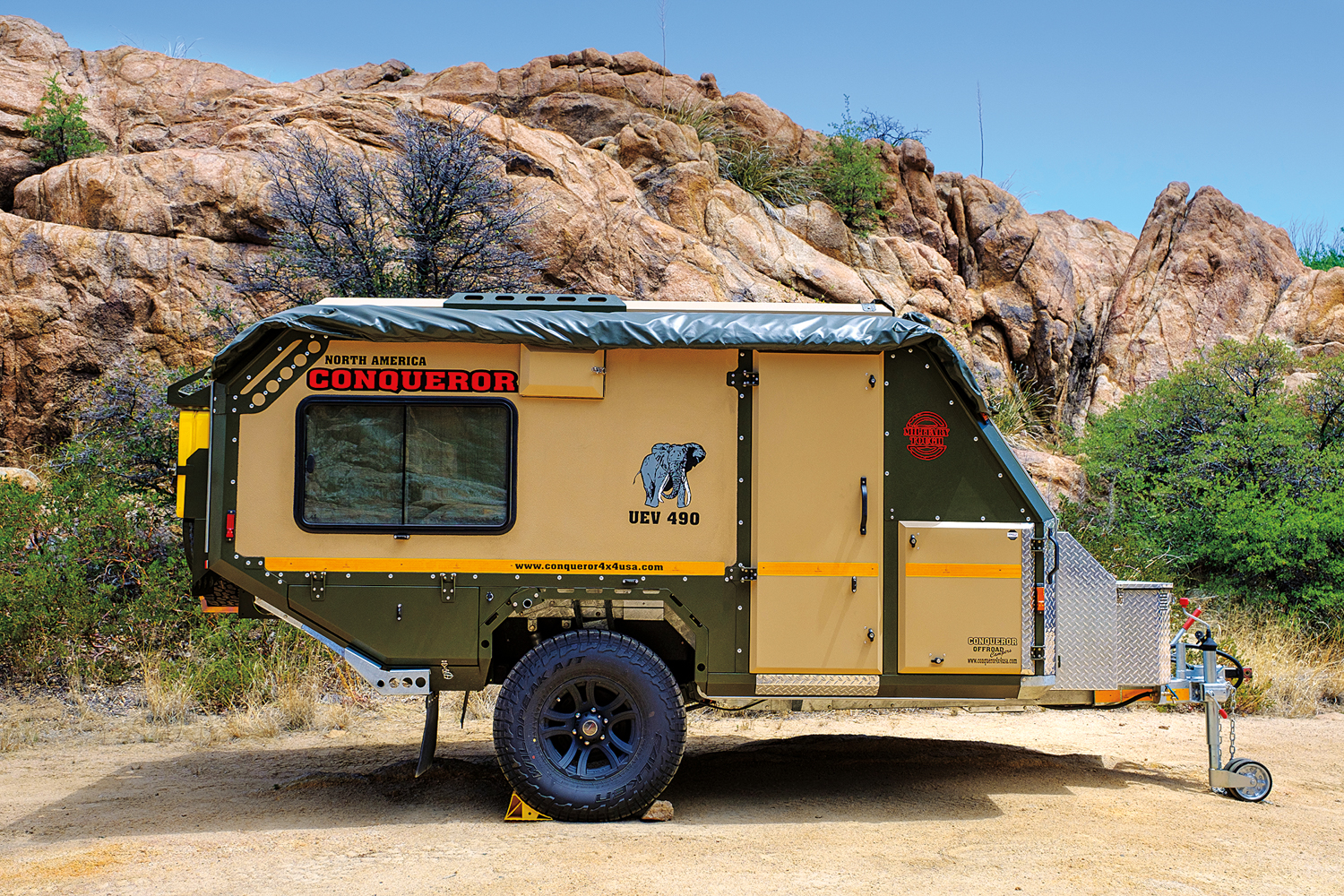 Conqueror started over 25 years ago as a maker of military trailers and equipment, with parent company Mega Manufacturers focusing on in-house design and manufacturing for the South African and international markets. Constructed for the harsh environments of Africa and Australia, the intent of these models is clearly for long-distance, remote travel. The consumer products reflect their military heritage and are given the acronym Urban Escape Vehicle (UEV); the corresponding number reflects the length in centimeters.