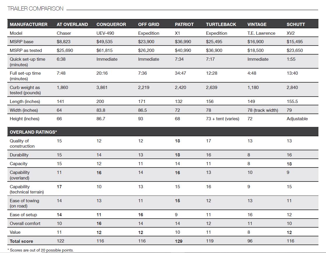 After weeks of testing and data compiling, the objective winner was clear, but each unit did exhibit a compelling attribute. For example, the XVenture provides the greatest utility but lacks amenities. The Turtleback is highly capable in technical terrain and is packed with true expedition support features like 46 gallons of water and durable, independent suspension, but it lacked sufficient storage, and the tent is nearly the same height as on the top of a vehicle, affecting ease of setup and center of gravity. The AT Overland Chaser is the technical terrain king and has a high storage volume for the overall dimensions, but it lacks the comforts of competitive offerings. The Vintage Overland is the style winner by a wide margin, but it is a soft-roader at best and would need a more robust drawbar and suspension to survive prolonged backcountry use. Which leaves us with the Conqueror UEV-490, Off Grid Expedition, and Patriot X1; all were either awarded our Editor’s Choice Award or was the overall scoring winner of the review. But how can a trailer win the test and not receive our Editor’s Choice Award? The Editor’s Choice Award has always been the product that not only scores well but is the product the editor would buy; it is their favorite solution which reflects all of their needs. In most of our tests, the objective winner is also the subjective winner, but not always.