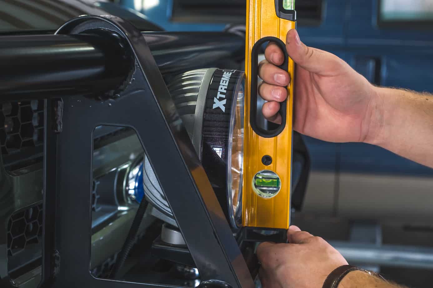 1. The first thing you’ll want to do is perform a basic alignment of the lights. Start by making sure your vehicle is level on a flat surface, and that the hardware on the lights is loose enough to make small adjustments with hand pressure, but tight enough that they won’t fall over when you let go of them.