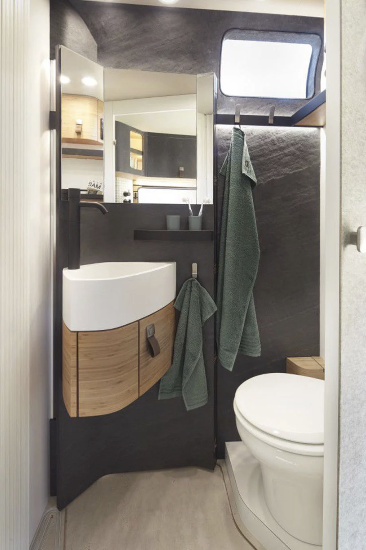 Custom panoramic windows give an unparalleled view of your surroundings while letting natural light in to open things up. The kitchen and storage drawers double as stairs to the bedroom, a rear deck folds out for additional exterior living space, and there’s a slide-out grill for when you want to entertain or have an outdoor cooking experience. Back inside you’ll also find a collapsible table in the rear dinette, which stores away to optimize living space when you don’t need it. Quite possibly one of the most impressive aspects, if you can really single out such a thing in this build, is Hymer’s wet bath conversion, which swaps between a surprisingly spacious bathroom to a shower in moments.