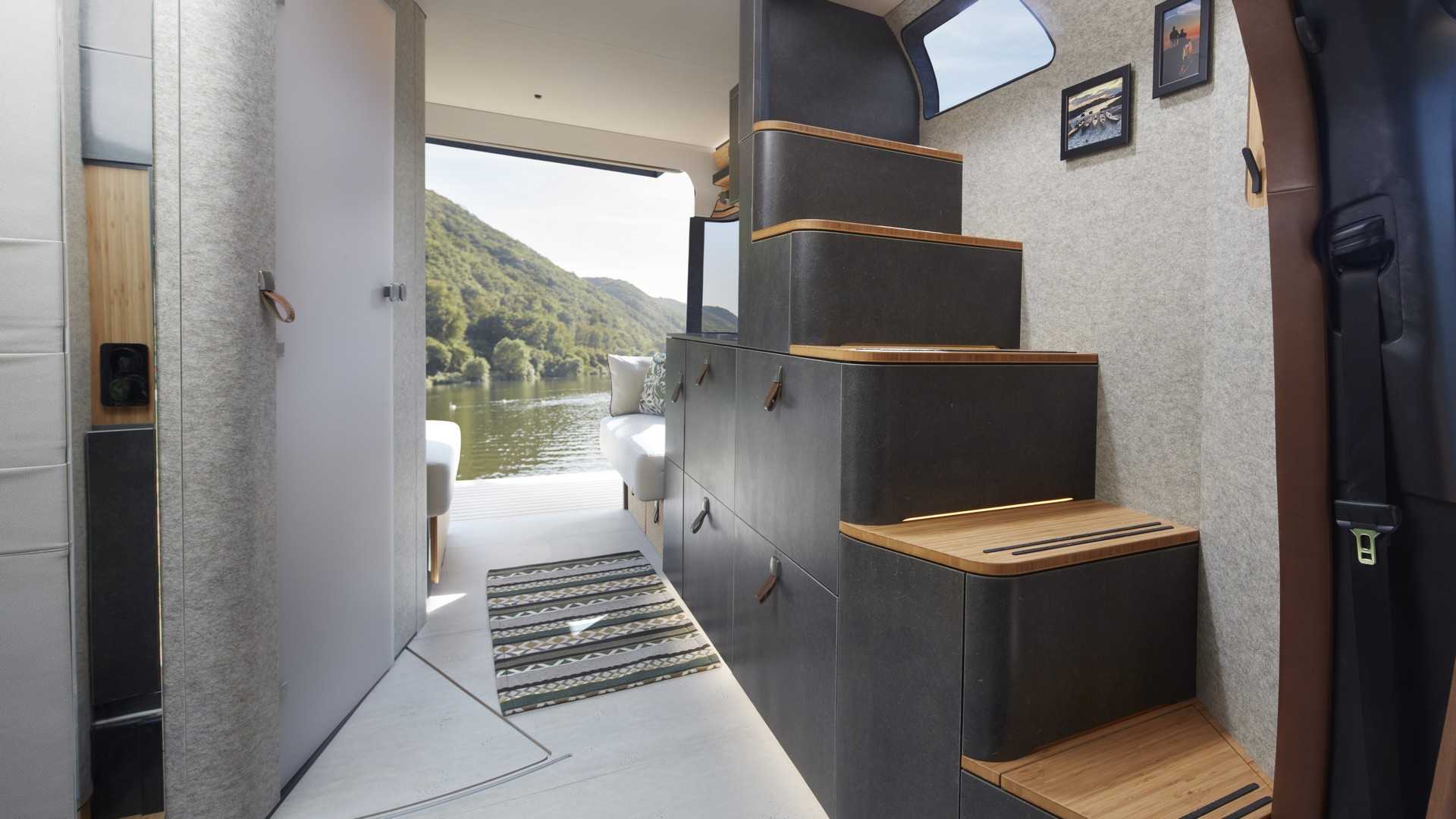 If you’ve been perusing Instagram lately, chances are that you’ll have spotted Hymer’s Vision Venture concept floating around. This beautiful adventuremobile is based on the new Sprinter and has a lot to brag about, including features such as four-wheel drive, an inflatable pop-top, a redesigned body, and more than 20 innovative materials from BASF which make it lighter and better insulated than any camper of its kind. Materials like their “ultra-resilient” paintwork with Chromacool technology reduce the surface temperature of the vehicle by 20°C (68°F) and that of the interior by up to 4°C (39°F). Yet, none of that inspired us to write this story. What really blew us away was the unreal interior design, which looks more like a million-dollar tiny-home than an RV. It takes space efficiency to the extreme by incorporating clever multi-function design elements but then combines it with superb styling and quality components.
