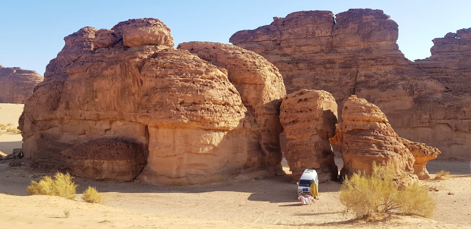 I arrived in Saudi in February 2020 and traveled for a month. Then Covid-19 happened, and it suddenly got difficult. I wasn’t able to stop everywhere anymore. I met Daniela [Wagner]—I think you published an article of hers on Expedition Portal—and we founded a WhatsApp group to keep in touch. Suddenly, the borders closed. Some Saudis offered a holiday house, a hut in the mountains because it started to get hot. We stayed there for one month, and we were brought bread every morning [and given] dips, boxes of fruit and nuts, masks, and gloves. We lived together in the house, and eventually, it was just me because I couldn’t go to Germany or Australia.