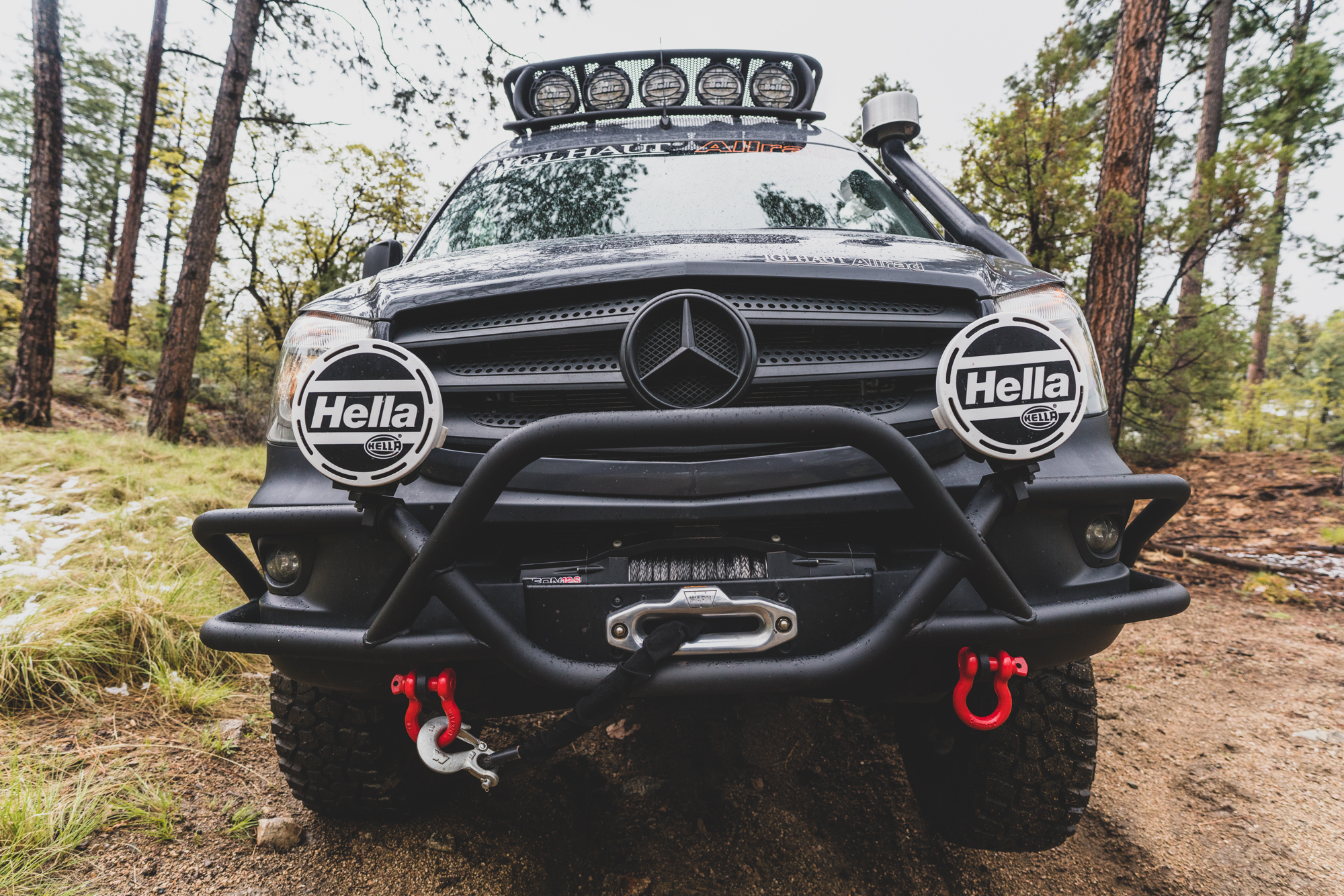 The unit I tested is the demo vehicle for Iglhaut Allrad USA, which includes the larger 37-inch BFGoodrich Mud Terrains, and a suite of Roambuilt accessories (check out the Roambuilt adventures). Modifications included a full-length rack with ladder, structural side steps (which function as modest sliders), a rear bumper, and a front bumper with winch. While these accessories added to the vehicle weight, the interior build was modest, and everything was well within the payload of 4,000+ pounds (GVWR).