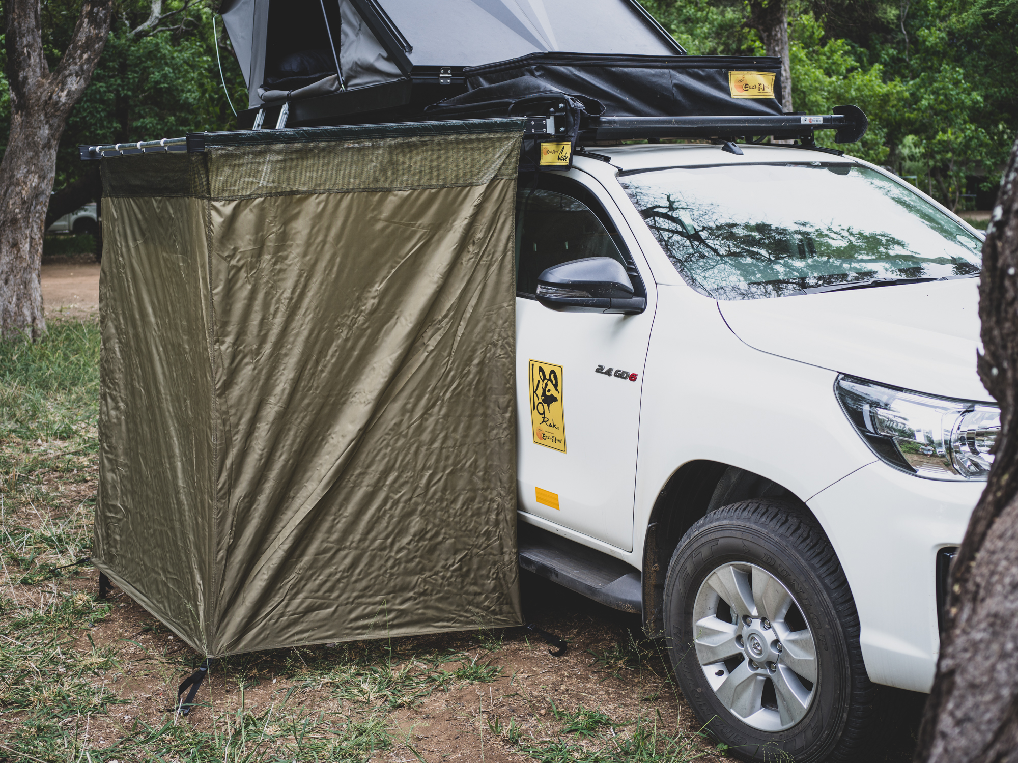 I was recently in South Africa, overlanding through Mapungubwe in the north, which is settled along the border of Botswana and Zimbabwe. The Limpopo River flows through there, and the region is packed with mega-fauna. The goal of the trip was to test the new Hilux and also evaluate the cadre of new equipment from National Luna, Eezi-Awn, and others. Any good African camp includes a roof tent (because of lions and black mambas) and a braai (BBQ), but it was the new Eezi-Awn K9 Cube shower enclosure (privy) that stood out as particularly unique.