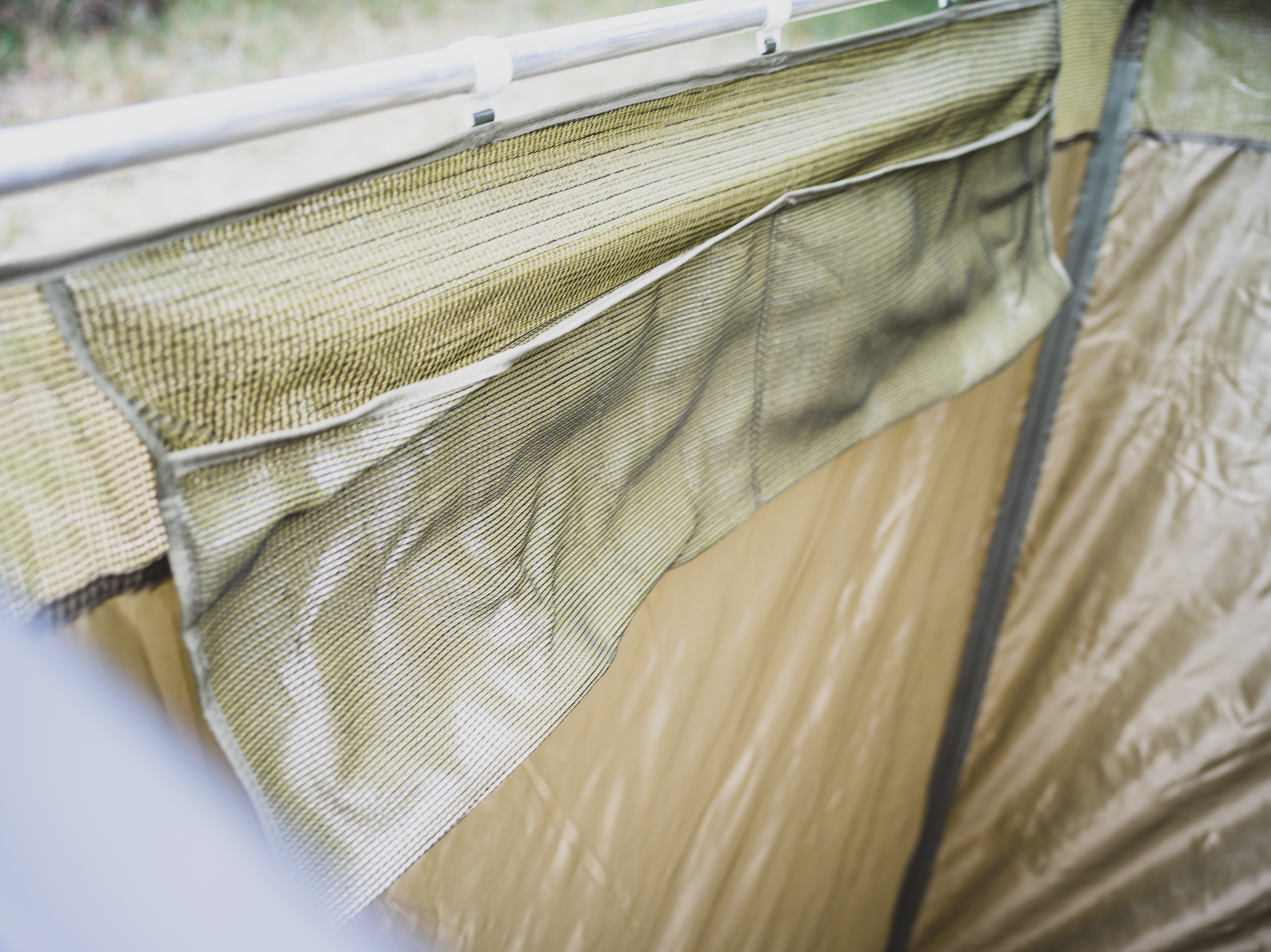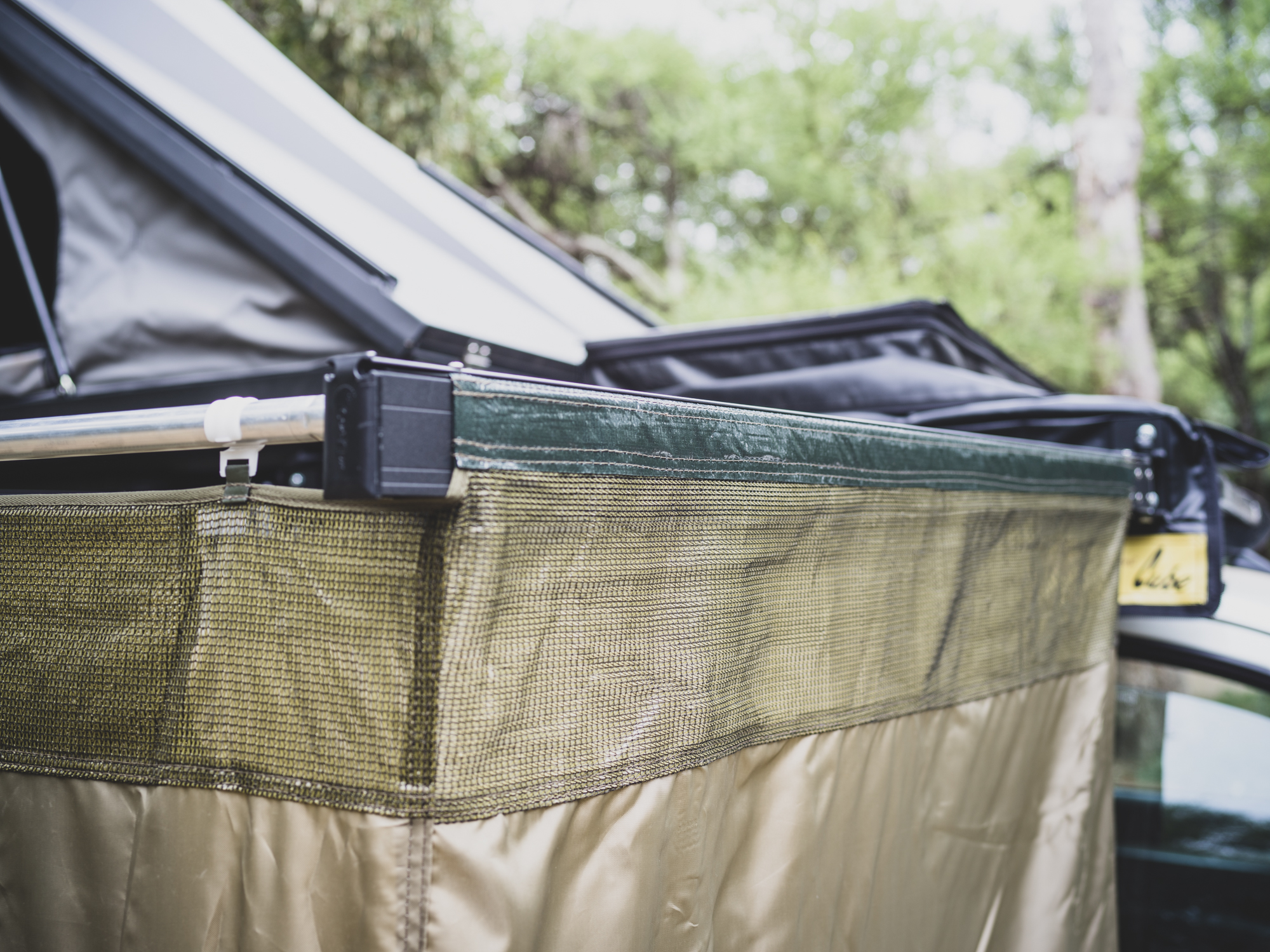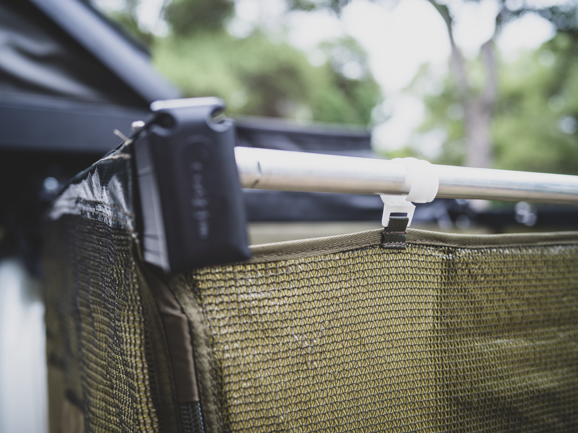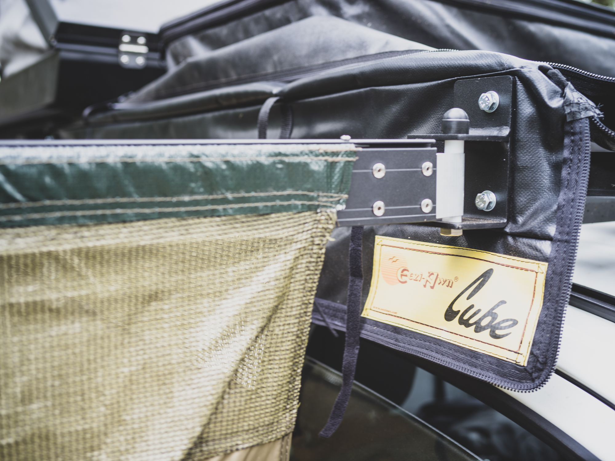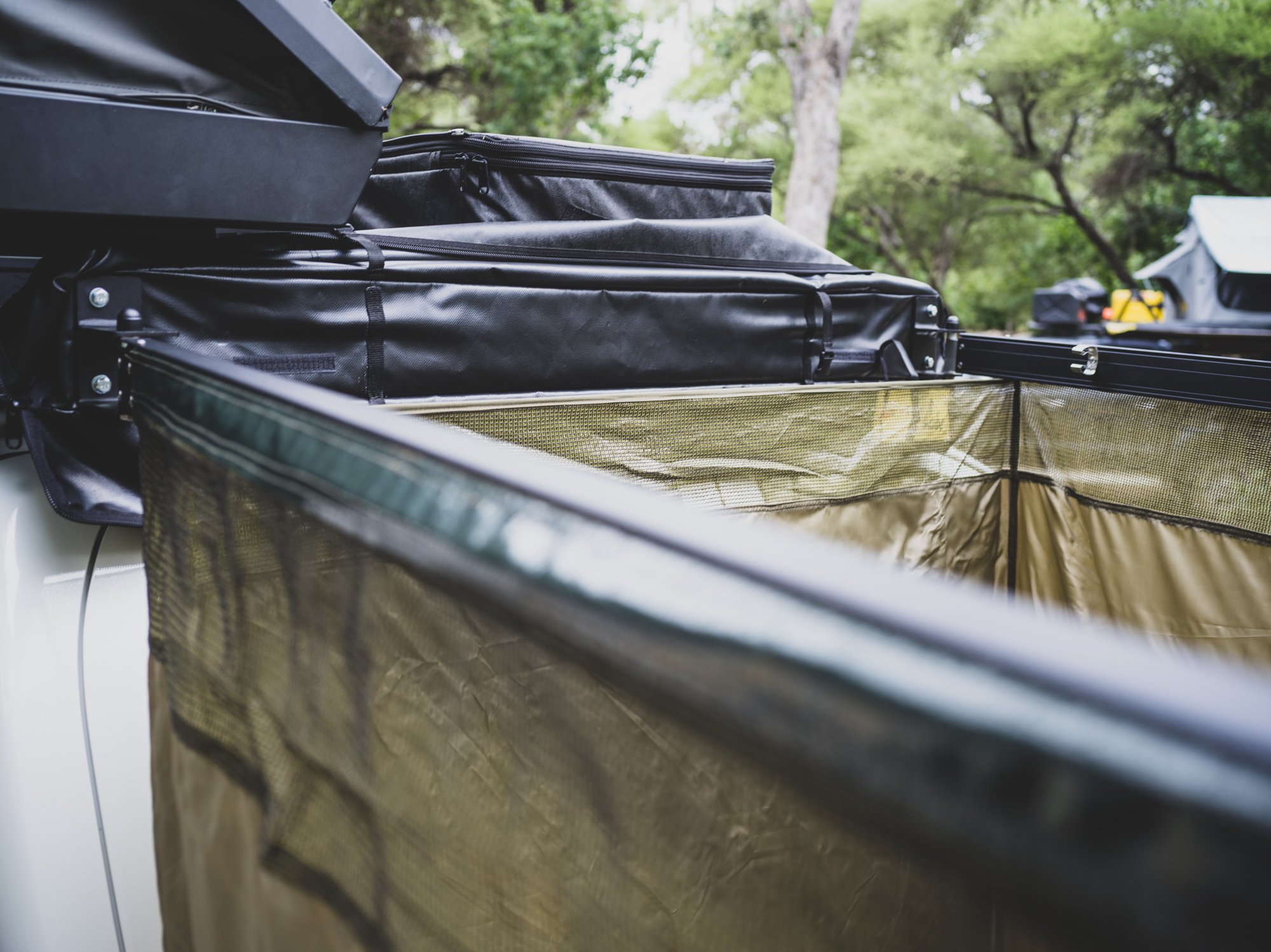 The enclosure is supported by a heavy-duty aluminum extrusion backing plate that will affix to most racks using the supplied brackets. After unzipping (with proper YKK zippers) the heavy-duty PVC cover, it just takes a few minutes to deploy the self-supporting aluminum rafter extrusions and connect them to the adjustable forward cross pole. With a few clips on the forward pole, the mildew-resistant ripstop nylon walls are secured and the unit is ready to use. In wind, it is a good idea to stake out the corners.