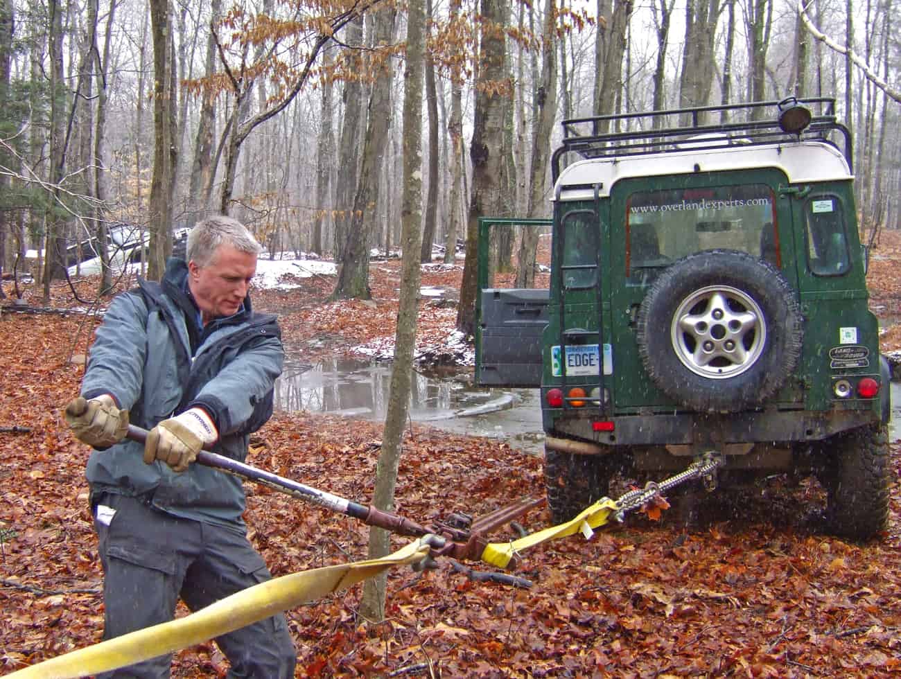 So: You have defined the situation as a vehicle high-centered on a stump. Time to formulate a plan. You have determined that you cannot use a kinetic rope, because the vehicle is firmly grounded on the obstruction and to simply drag the vehicle off could cause damage to the undercarriage. Same reasoning applies to the winch: You don’t want to simply drag the vehicle, and while it is possible to lift a vehicle with a winch, it’s not as easy as it looked in The Gods Must be Crazy.
