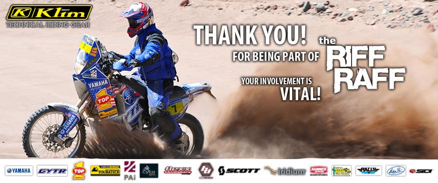Even with a lineup of sponsors the Dakar Rally can be an expensive endeavor. Started by Rally Pan Am fans on ADVrider in 2007 the effort to support Dakar Rally hopefuls has grown. This years efforts are supported by some great brands including Klim, Touratech, FasstCo, Motion Pro, Hammer Nutrition, Top One Oil, Baja Designs, Scott USA, Promotobillet and WARN Industries. These companies have coordinated to support Jonah Streets supporters by putting together a sweet gift package for those who donate at the Riff Raff Extreme Package level. It even includes a limited edition Klim Inferno Jacket and discounts worth far more than the $175 contribution! http://www.jonahstreetracing.com/ (Note, there are other levels of support too.)