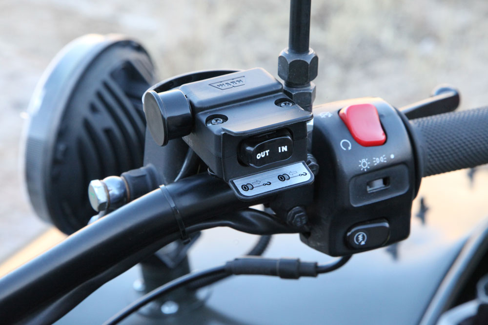 At the heart of the system is Warn’s ProVantage 2500-S winch fitted with 50 feet of synthetic line. Designed for ATV use, it is a compact winch with all the power required to extract the Gear Up from any potential recovery situation. Installation of the winch and its various components did require some creating thinking, but mounting options abound on a platform like the Gear Up. One of the more delicate components, the winch solenoid, was placed in a protected location beneath the seat giving easy access to the battery terminals just below. The handlebar switch was mounted by the right-hand controls providing easy access to the winch functions without compromising the ability to work the throttle and brake. The more complex issue to be resolved was how to route the winch wiring leads. Using large gauge Anderson plugs for maximum durability, the winch can be quickly disconnected for an easy transfer from one end of the motorcycle to the other. This also facilitates easy removal of the winch if it is not needed for a given ride.
