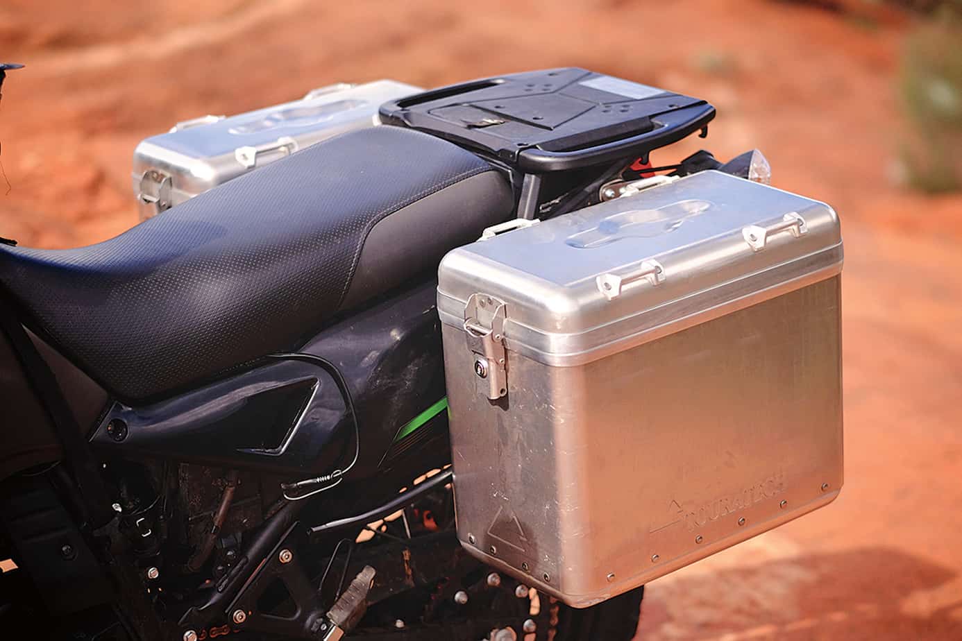 The goal of this project was to prepare the KLR for remote, all-terrain travel. One decision any adventure motorcyclist must make is whether to select hard luggage or soft bags. For this build we wanted to reevaluate hard luggage and test the new Touratech Zega Mundo units in the process. These 38-liter (left) and 31-liter (right) aluminum panniers utilize a riveted and silicon-sealed construction instead of being welded. In addition, the product is also lighter and dimensionally smaller than typical side boxes, with an austere, clean look. The rack-mounting system installed easily and the boxes connect with four composite tabs and internal tension knobs. Low profile anchor loops are mounted to the lids and permit lashing of small accessory bags. My biggest complaint, and one I attribute to most hard cases, is their width, which can become an issue on tight trails, including the hazard of the box trapping the boot when the inevitable foot dab occurs. Crafted in Germany, Touratech cases are slightly more expensive, but are dust and waterproof and assembled from corrosion-resistant materials.
