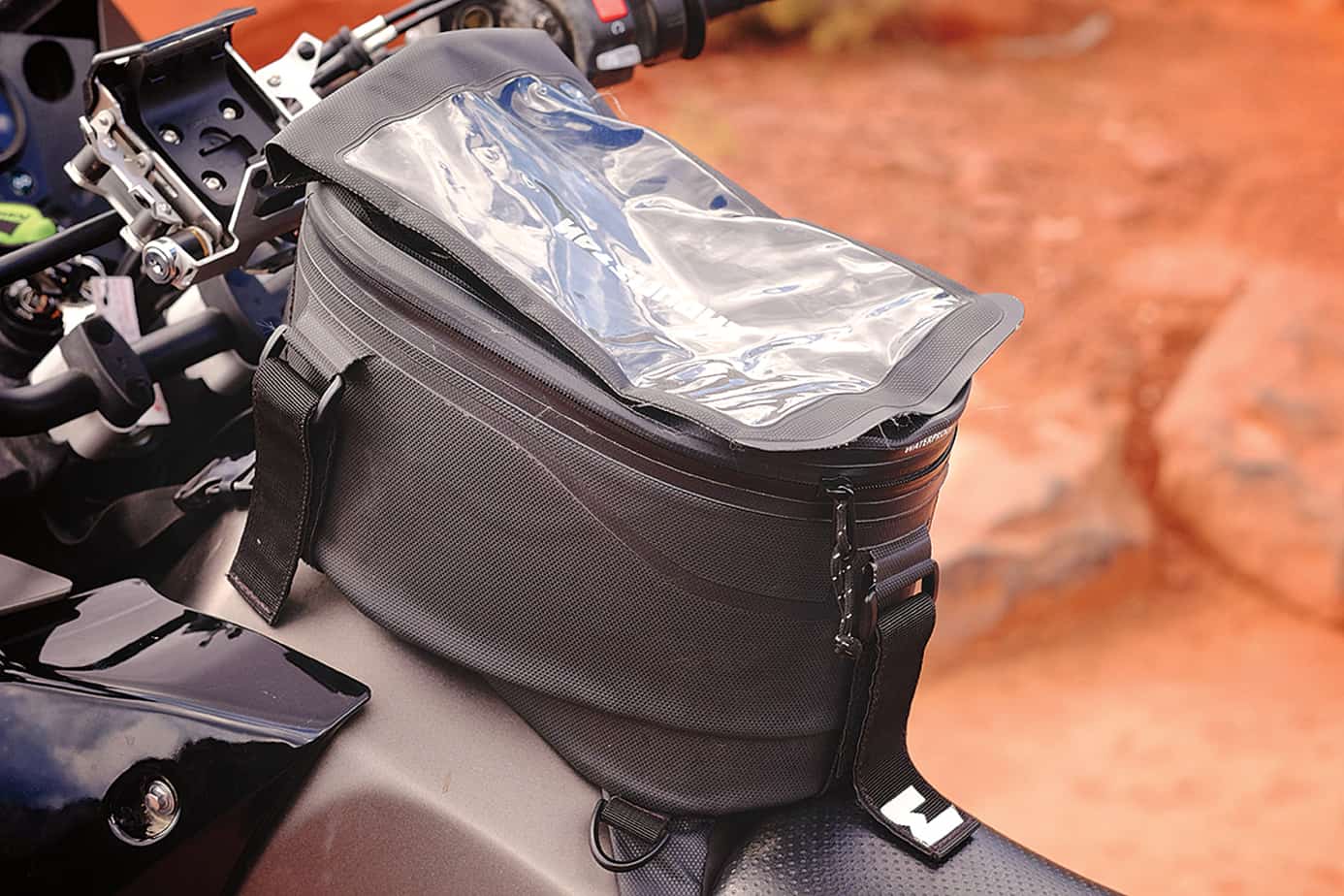 The final touring modification was the addition of our trusty Enduristan Sandstorm tank bag, just big enough to hold a mirrorless camera system with a few lenses. These tank bags are the best we have found for water resistance and protection of contents.