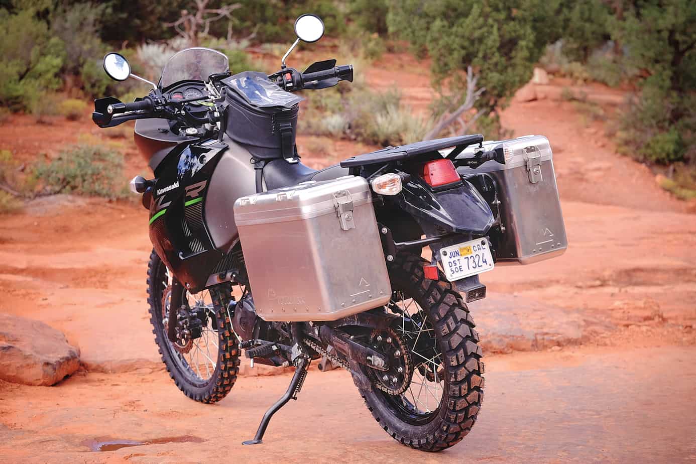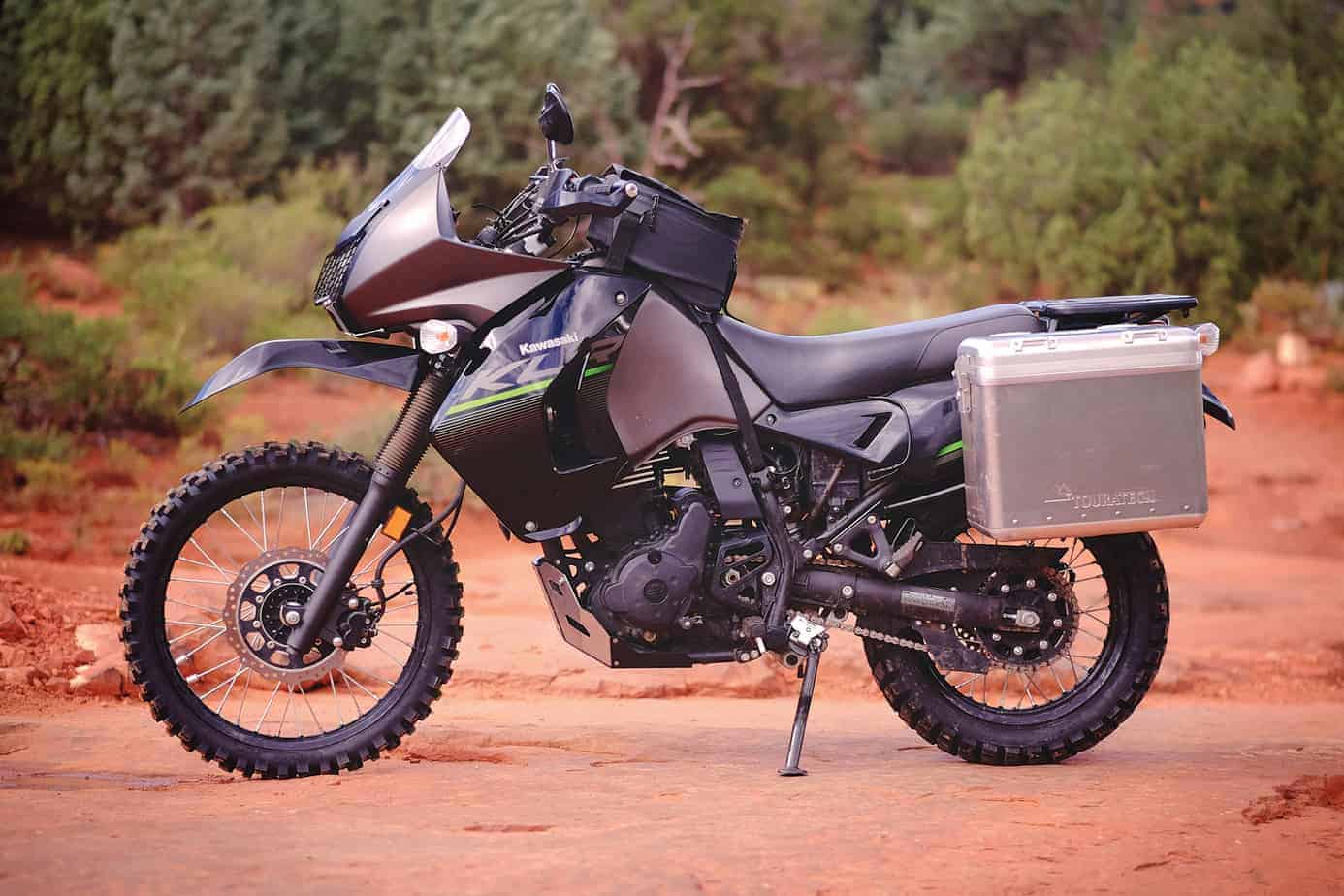 Few dual-sport riders will question the KLR’s reputation as a true around-the-world motorcycle. With its generous 6-gallon tank and reliability, it is a common choice for global travelers. The 650 has also proven to be durable, particularly in 2014 or newer trim; the latest model features stiffer springs and valving tuned for heavier loads. The seat is wider and more comfortable, allowing the rider’s backside to match the extended fuel range. Our team was so impressed by the 2014 KLR that we added it to our long-term test fleet and made a few modifications to prepare it for journeys further afield.
