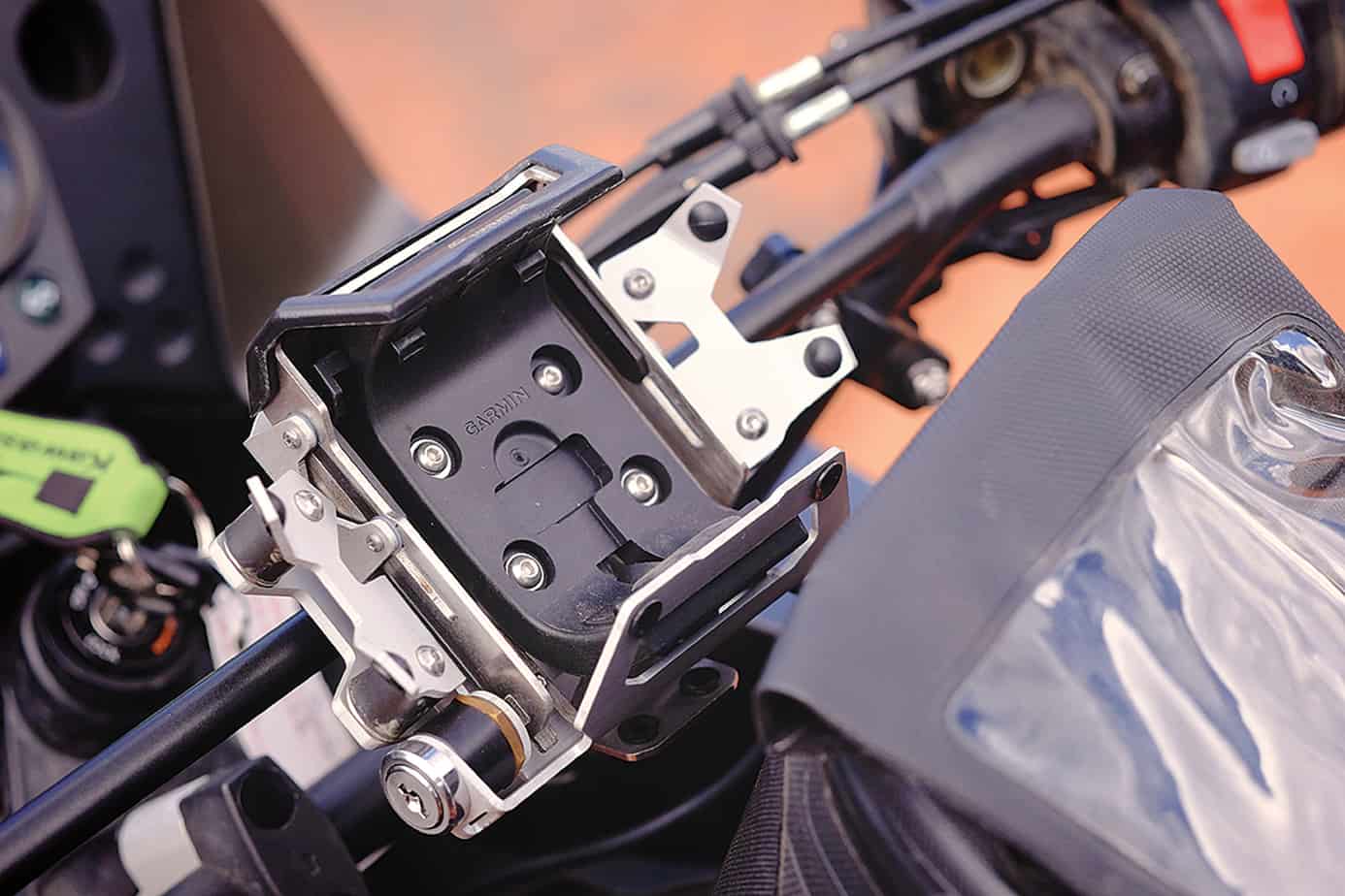 We also included a handlebar mount for the Garmin Montana GPS. Unfortunately, navigation units have actually degraded over time, but the Montana is one of the few remaining choices for an adventure motorcycle. Touratech makes a quality cradle that securely holds and locks the device to the KLR. We permanently wired the bracket for 12-volt power and key-matched the tumbler to the panniers. While working on wiring, it was convenient to install a cigarette lighter receptacle for operating additional accessories or charging phones in the tank bag.