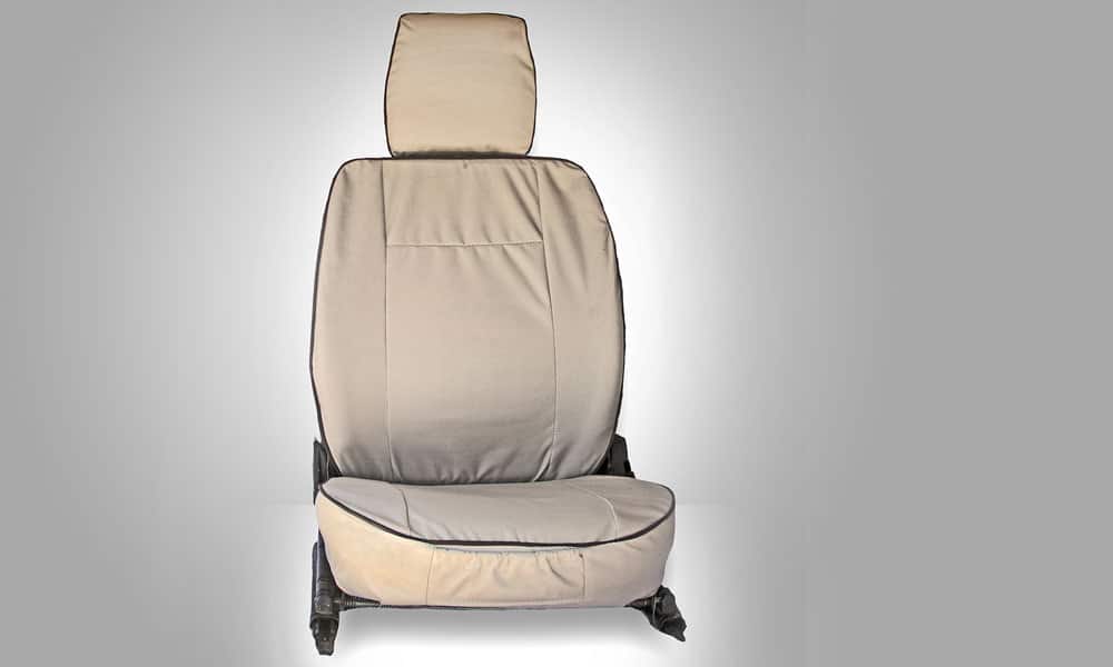 The Defender Covers we sourced were heavy-duty tan canvas. They fit like a glove, installed in a few minutes, and have stayed in place after weeks of hard use. Small details like the brass grommets, phone-pockets, and separate headrest covers, really show the attention they put into their products.