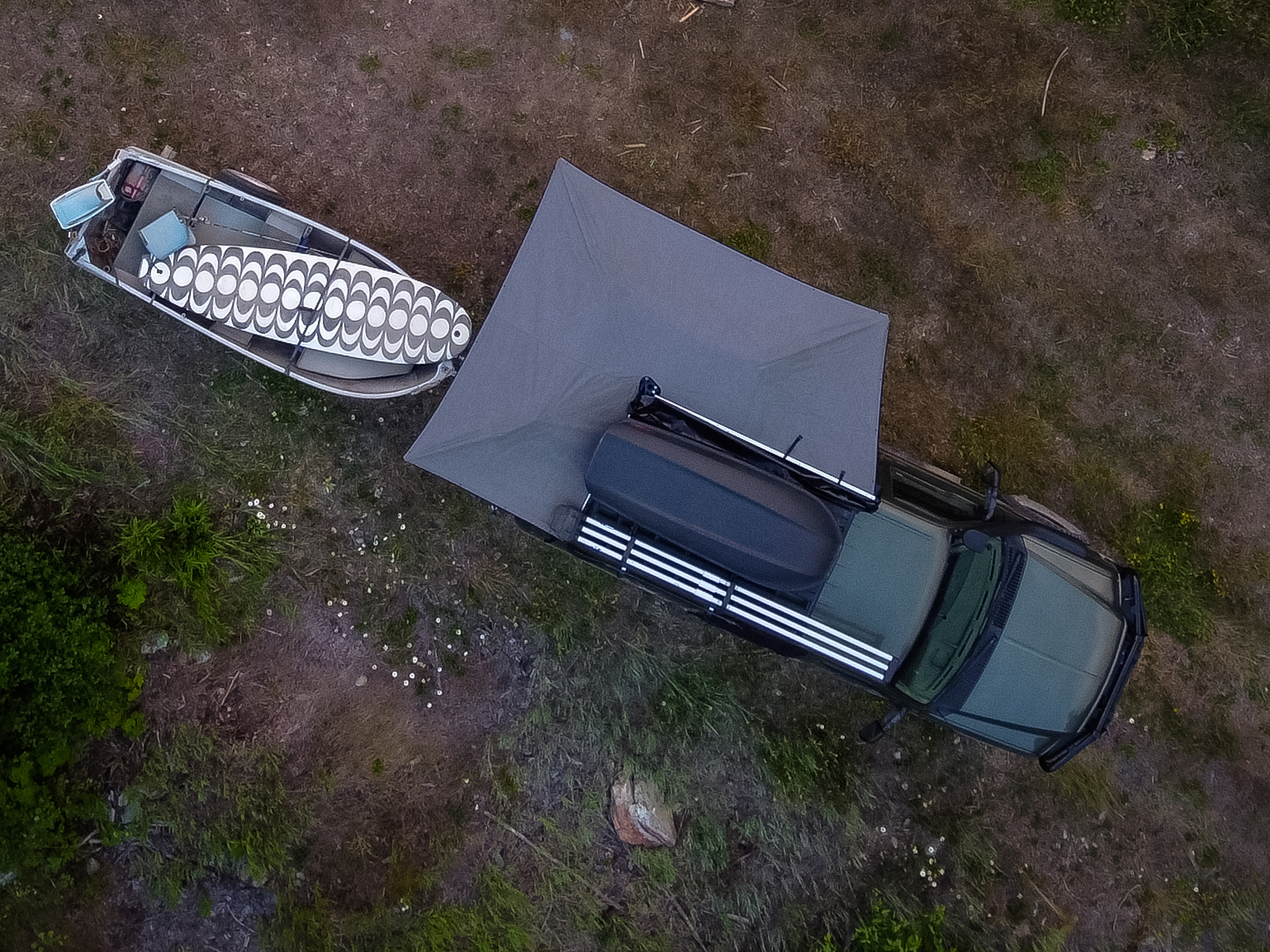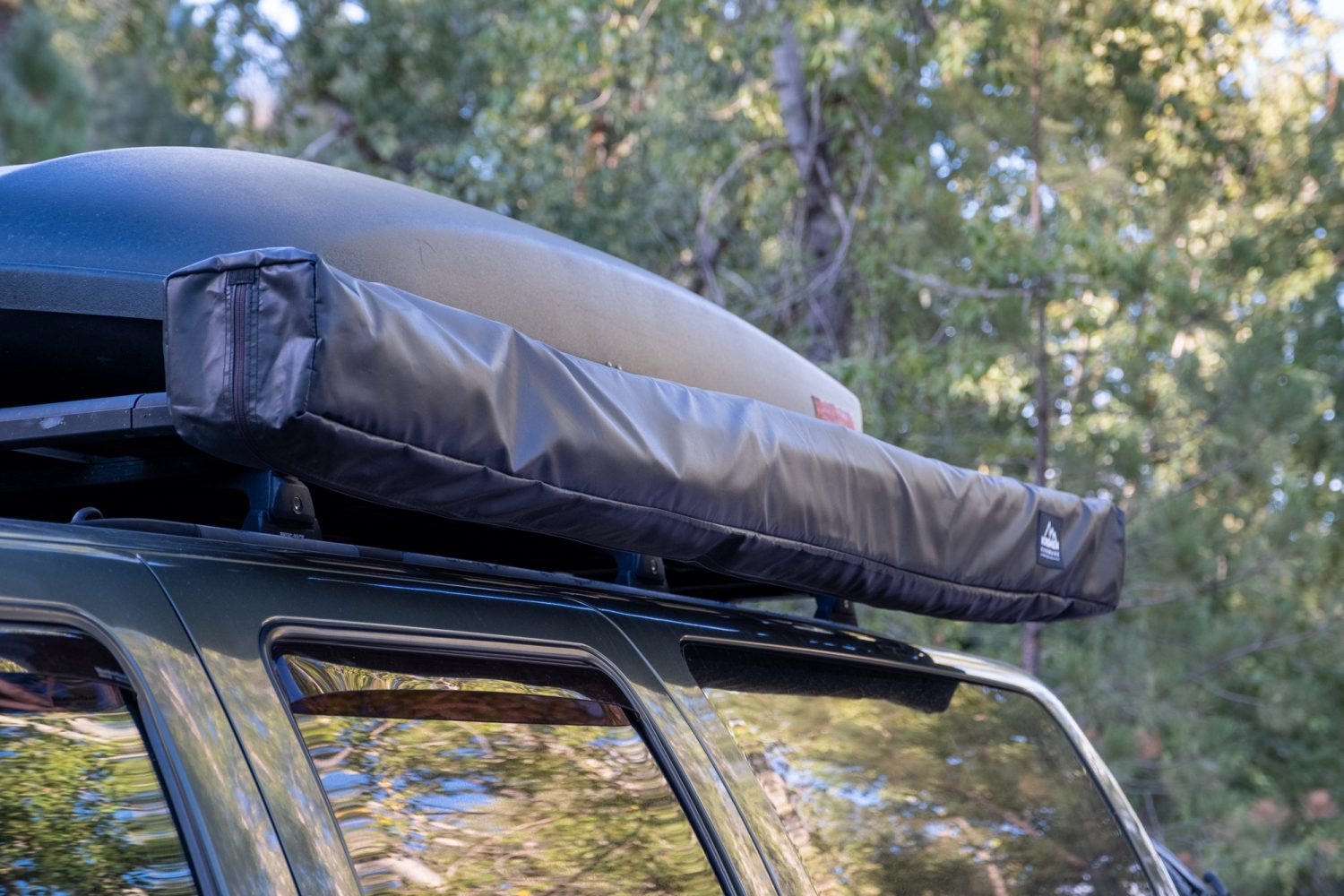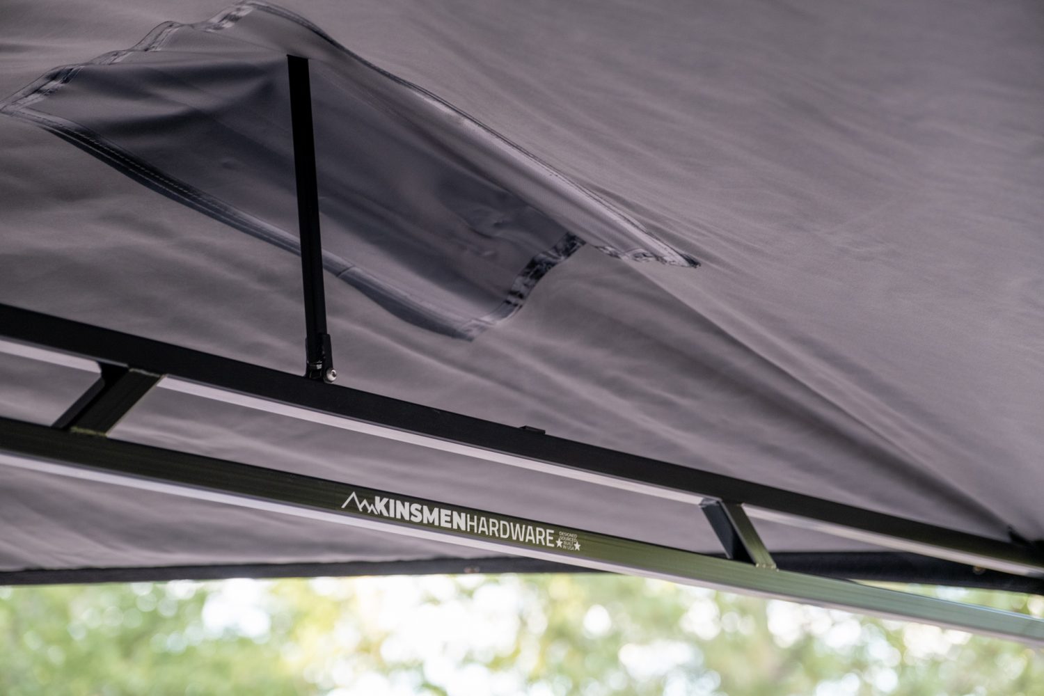 The awning is also classically American. It’s the muscle car of the group, built from US steel and canvas with a design that favors straightforward strength, speed, and simplicity over engineering finesse. The fabric isn’t an ultralight-aluminum-infused secret, but heavy-duty 314 GSM Sunbrella marine canvas intended for 24/7 exposure to the elements, ensuring a lifetime of resistance to UV rays, mold, and mildew. The powder-coated steel truss frame is masterfully welded and strong enough to support a grown man doing pull-ups. The vinyl-coated polyester cover has withstood tree branch strikes heavy enough to rip parts off a truck, and the YKK zippers laced with Mil-Spec paracord pulls still run smoothly after months of abuse. Stainless steel and brass hardware abound, with poly bushings in the main hinge and an industrial-grade stainless spring for the locking mechanism. Every piece of this awning is sourced and assembled in the USA, with the sole exception of the spring pin which comes from Italy—bellissimo.