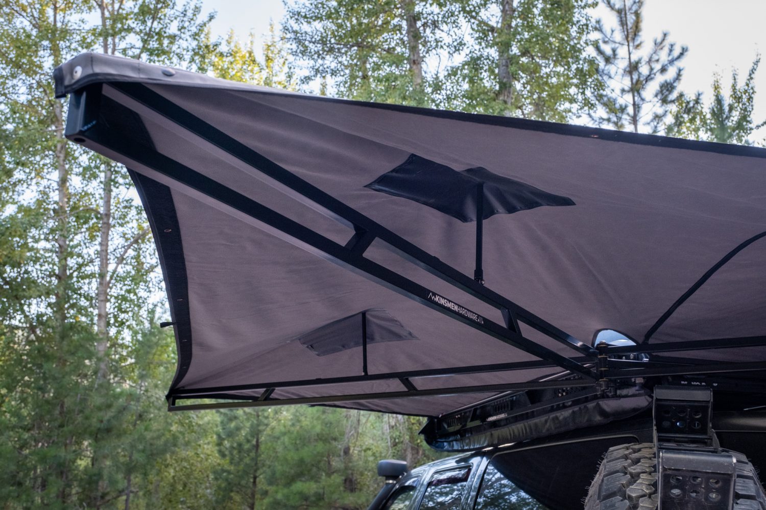 A few seconds here or there doesn’t equate to anything beyond bragging rights in camp, but the attention to detail on the Kinsmen, combined with its stability and strength, does. Unlike other awnings, I find myself deploying it multiple times per day on our trips. Coverage is ample at 167.9 square feet; I’ll throw it out for a lunch break, use it to shield the rain on a coffee stop, and open it to hang some lights for camp poker. If bad weather is forecast, the three pop-up arms prevent water from pooling and secure the tension strap to fight off the wind. Guyline webbing loops perfectly positioned on the fabric secure the awning and prevent flapping in high winds. There is even a spot for an aftermarket support pole in case you want to string a hammock up on the armature.
