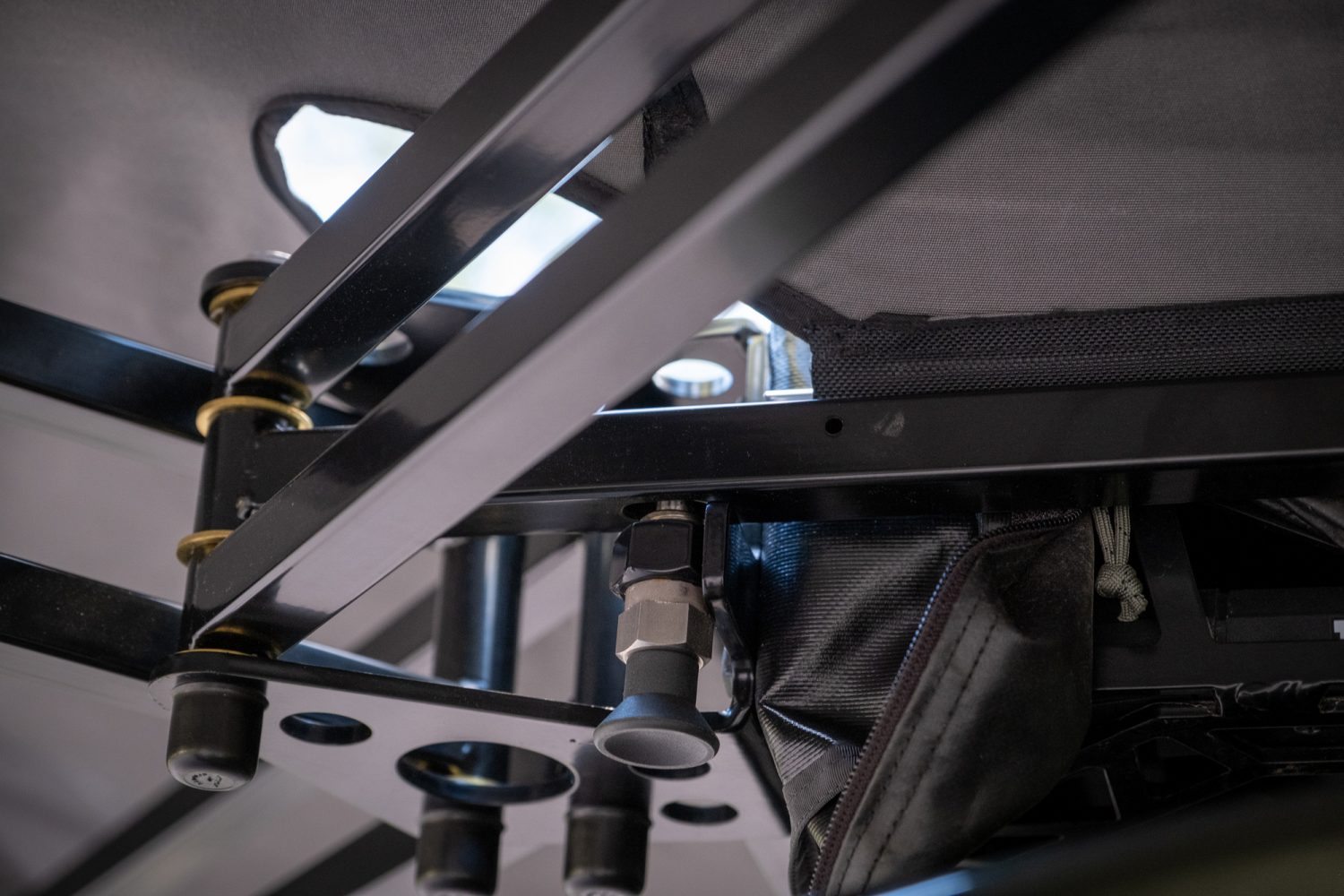 The awning is also classically American. It’s the muscle car of the group, built from US steel and canvas with a design that favors straightforward strength, speed, and simplicity over engineering finesse. The fabric isn’t an ultralight-aluminum-infused secret, but heavy-duty 314 GSM Sunbrella marine canvas intended for 24/7 exposure to the elements, ensuring a lifetime of resistance to UV rays, mold, and mildew. The powder-coated steel truss frame is masterfully welded and strong enough to support a grown man doing pull-ups. The vinyl-coated polyester cover has withstood tree branch strikes heavy enough to rip parts off a truck, and the YKK zippers laced with Mil-Spec paracord pulls still run smoothly after months of abuse. Stainless steel and brass hardware abound, with poly bushings in the main hinge and an industrial-grade stainless spring for the locking mechanism. Every piece of this awning is sourced and assembled in the USA, with the sole exception of the spring pin which comes from Italy—bellissimo.