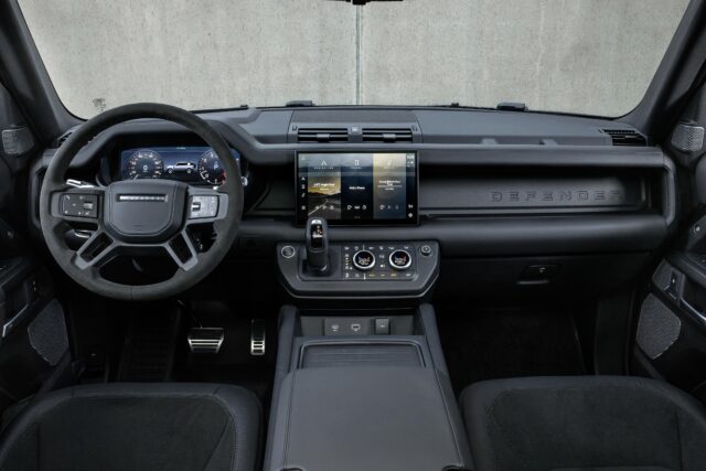 The new Land Rover also looks the part with unique exterior badging, quad-exhaust tailpipes (calibrated to suit different driving situations), 22-inch alloy wheels, three colours (Carpathian Grey, Yulong White, and Santorini Black), and Xenon Blue front calipers. Further still, the company offers greater personalization with new exterior packs: the Bright, Extended Bright, and Extended Black (these include Noble Chrome finish for front and rear skid pans/front grille/badging, and Ceres Silver to lower body cladding, and wheel arches). The interior is trimmed in Ebony Windsor leather, illuminated tread plates are completed with a V8 script, and the exposed Cross Car Beam features a Satin Black finish. The four-spoke steering wheel is enhanced by an Alcantara rim and tactile satin chrome gearshift paddles. There have also been updates to the Defender’s Pivi Pro infotainment system, which receives a signal booster, improved connectivity, and an optional larger 11.4-inch touchscreen. Additionally, the advanced navigation uses self-learning algorithms and dynamic guidance to optimize routing, whilst the built-in Software-Over-The-Air helps deliver the latest mapping. Finally, the company announced the Defender V8 Carpathian Edition, which showcases unique styling cues and will be the very pinnacle of the Defender range.