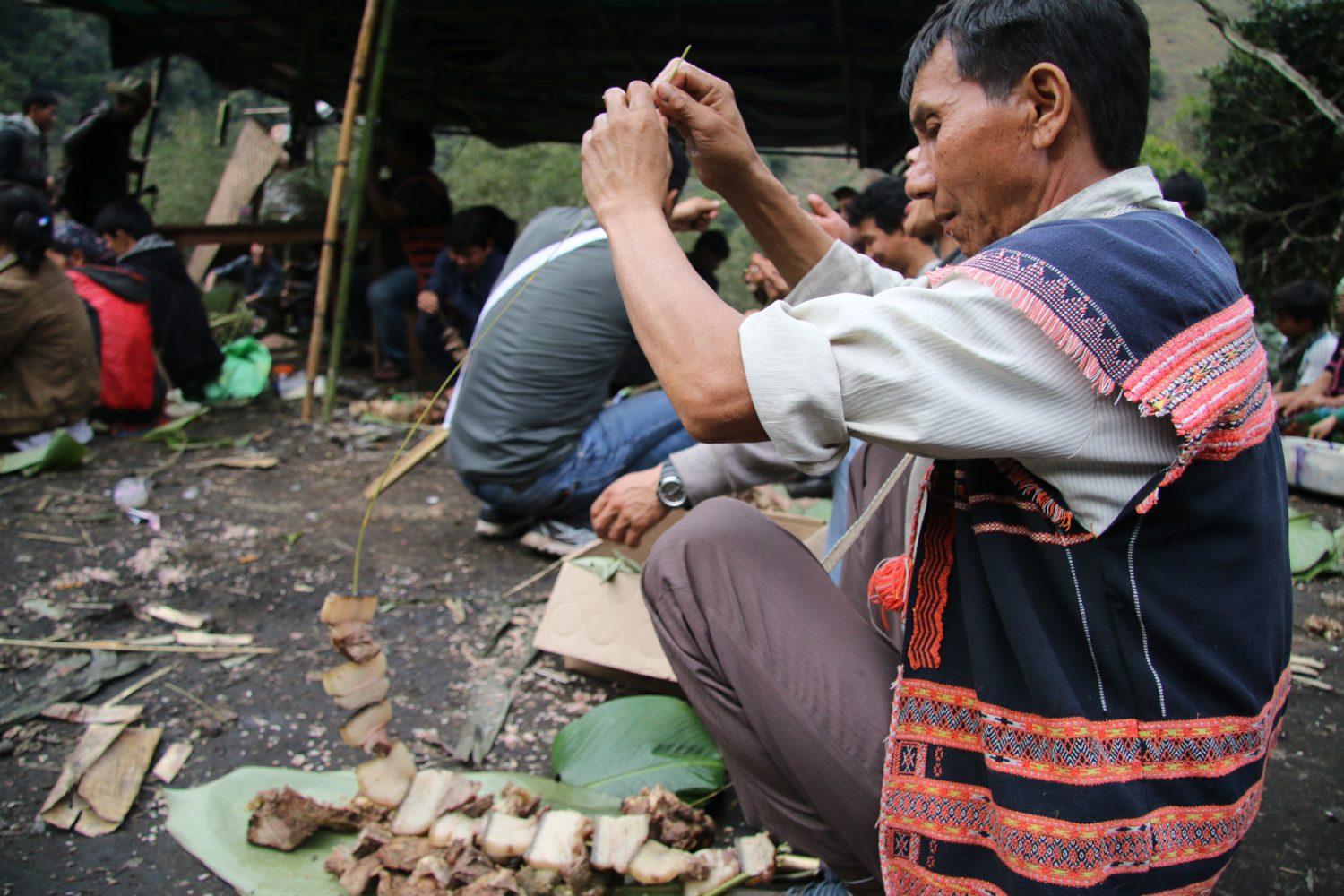 The rest of the day passed in an orgy of drinking, butchery, and carousing, like an Idu version of Burning Man, just with more blood and gore. At around 4 p.m., by which time so much rice wine had been consumed it was a miracle anyone was still standing, a prodigious feast was served. Several hundred Idu sat in rows on the ground while lines of men and women handed out palm-leaf plates, piling them with armfuls of boiled mithun and rice. After witnessing the earlier slaughter, I settled for just the rice.