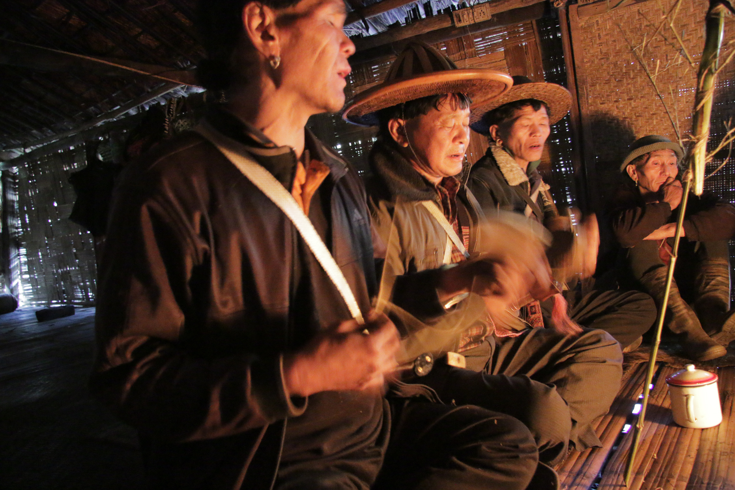 At dawn, Sadhu led me to a bamboo hut where three male shamans, or igu, sat beside a fire, singing to the spirits in eerie, contorted voices. They were offering up the souls of the soon to be sacrificed mithun, Sadhu explained, their trance states achieved through singing, the beat of small handheld drums, and the power of their guiding spirits. In the middle sat the chief igu, a gentle-looking man of indeterminate age, his long black hair tied in the traditional Mishmi knot. The whole scene felt closer to Alpha Centauri than Delhi.