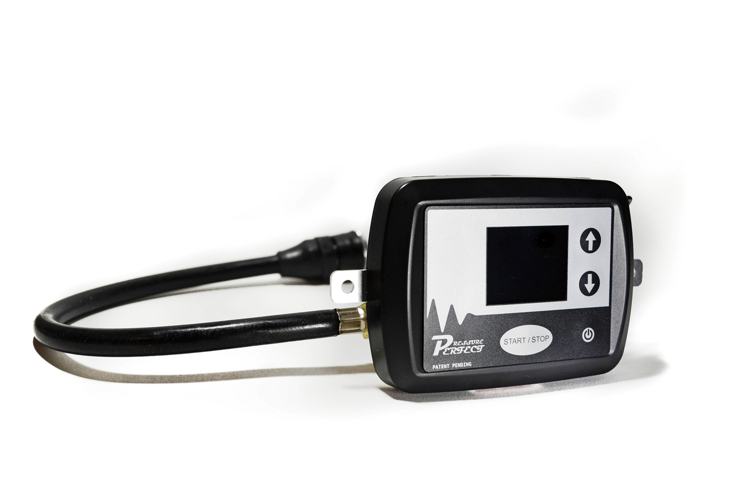The Pressure Perfect is in a league of its own. Not only can it precisely compensate for elevation, it can also be connected to a compressor for reinflation. The digital display is powered by connecting the provided battery clamps to a 12-volt power source. The pressure is then easily adjusted via the up and down arrow keys located on the face of the display.