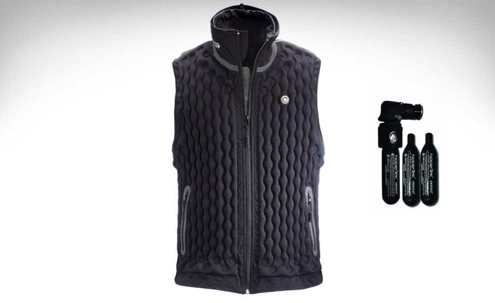 The final report is a bit hit or miss. For genuine outdoor activities like skiing, snowshoeing, ice climbing or other pursuits, I’m not sold on it. It’s chunky feeling. It makes me feel like I’m wearing an exoskeleton. The inflation is a bit of a hassle as well as expensive with the argon gas. That said, I have found a great application for it under my motorcycle jacket. I inflate it for early morning temps for maximum insulation, and as the sun warms me, I reach in my jacket, expel the air, and a layer magically vanishes…sorta. It is a far less complicated alternative to electric gear on the bike. Because motorcycle riding doesn’t involve dynamic torso movements, I don’t even mind the stiffness.