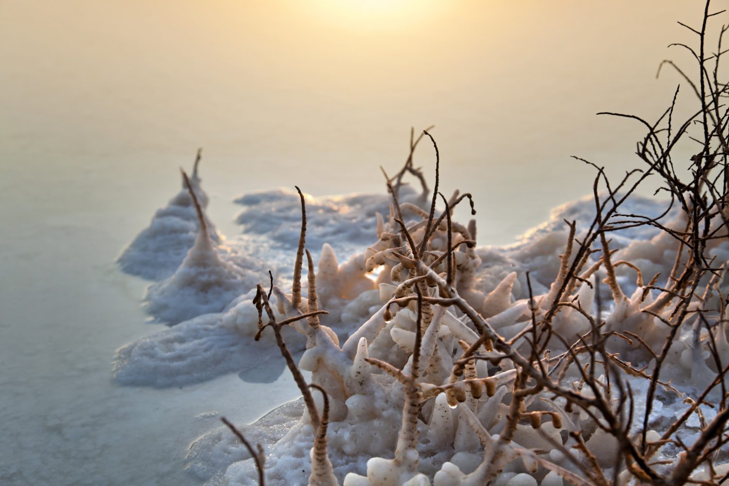 It’s dawn at the famous Dead Sea in Israel. Salt clusters grouped on the remains of a withered bush break the orange hues reflected in the calm shallow waters.