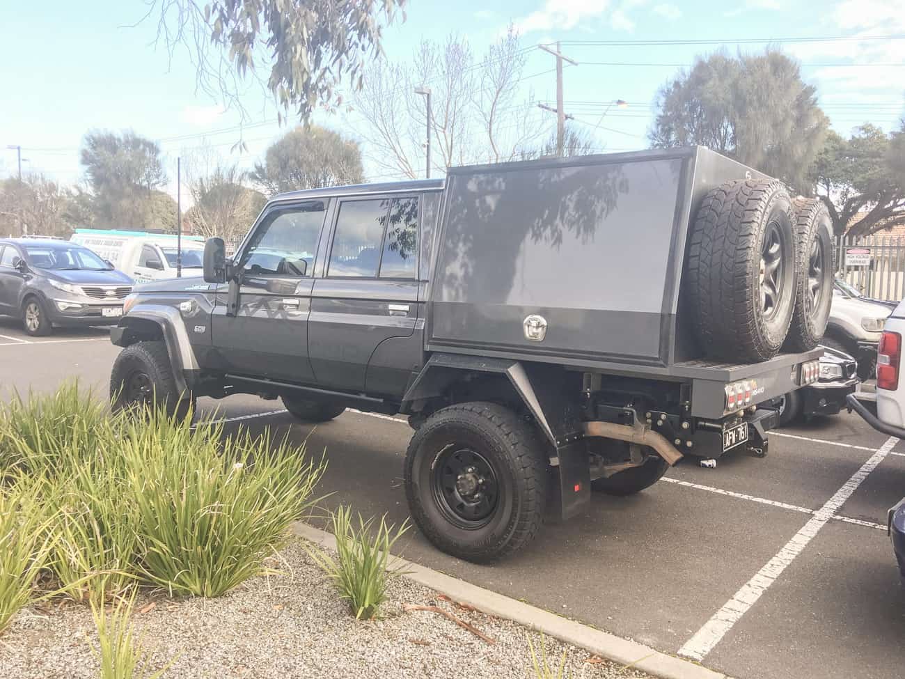 Even the parking lot is ridiculous. The outcome of this turbo-diesel V8 VDJ79 with tray back and cargo box is both clean and functional, minimalist in all the right ways and with a few hidden gems, like a 6-speed automatic conversion from Marks 4WD.