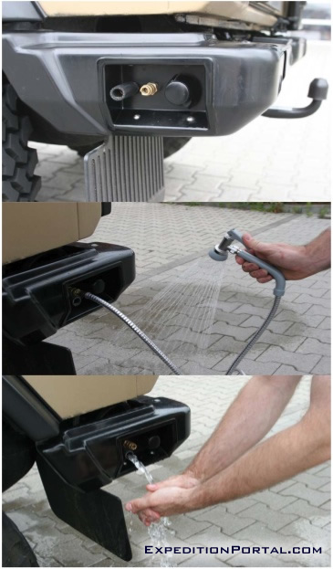 Furthermore a water tap for easy and convenient access to water has been fitted by the rear bumper, as well as quick coupling for connecting of a shower.