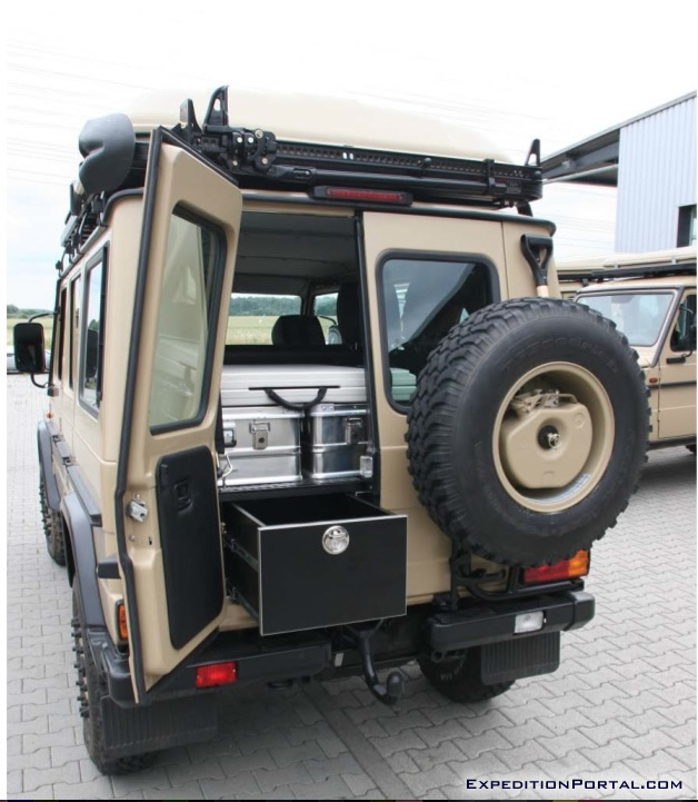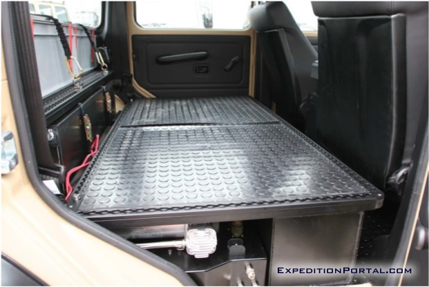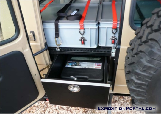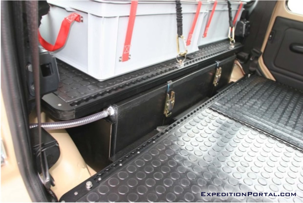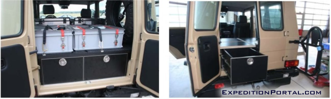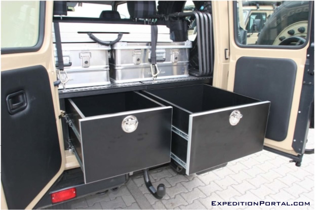 Vehicles have been fitted with a double draw system. These heavy duty draws run on double ball sliders providing the smoothest action even under the heaviest loads. The left draw is accessible from the outside of the vehicle by opening just the left half of the rear door, thus