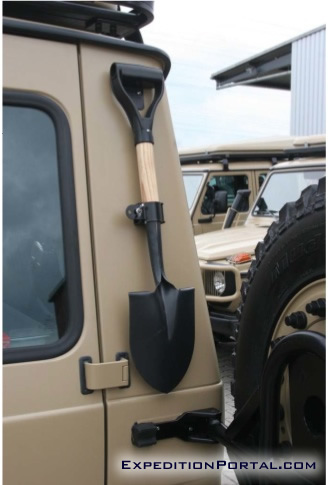 One additional spade has been conveniently placed behind spare wheel.