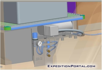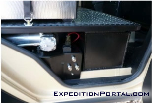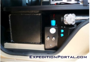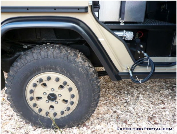 Each vehicle is fitted with 2 separate air compressors and an air tank to secure pressurized air at all times. We have chosen to fit 2 smaller compressors (rather than one large model) to ensure that there is still the ability to pump air even in the case of failure of one compressors. These are coupled to a special pressure regulator that allows all four tires’ pressures to be simultaneously adjusted (increased or decreased) in minutes. This can be achieved by simply connecting specially designed tire connection hoses to quick couplings which are placed next tothe rear doors on each side of the vehicle.