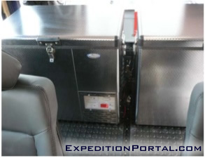 Each of the 2 units can be set anytime to work at positive (refrigerator) or negative (freezer) temperatures, to suit specific needs. We have designed a special platform to fit over the permanent auxiliary tank that takes these 2 units when there are no rear passengers. This also allows easy access of these appliances from driver and co-driver seats. When more people are travelling and the rear bench is fitted, the units can be moved to the trunk/rear part of the vehicle. There is sufficient unused empty space in front of the fridge to store and secure travelling luggage and other objects.