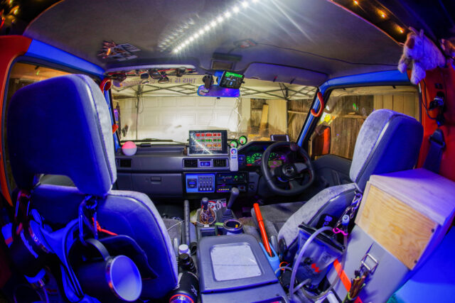 A custom leaf pack was designed and features a “military eye” where the leaf spring hooks up, which improves strength. At the same time, additional leaf springs were added to prevent sag, and I carry spares just as a precaution. The L300 runs Rancho RS9000 XL adjustable shocks, which give us the ability to dial our ride for different surfaces. This setup came into its own when we traveled up to Tuktoyaktuk in Canada. There are Monroe air shocks in the rear to level the van when it’s heavily loaded (which is most of the time) and bigger torsion bars up front. We did most of the work ourselves but had shims fitted professionally to get the alignment spot-on. Dual-piston brake calipers with slotted rotors were added, but we’re currently upgrading to 16-inch rims and fitting bigger rotors (approximately 315 millimeters). The L300 is a truly remarkable all-terrain vehicle with a dedicated low-range box, and despite weighing 7,200 pounds, we’ve been able to get up some very steep technical inclines. There’s a limited-slip diff in the rear, but the dream would be to fit a locking front differential, although we’ve yet to need one.”