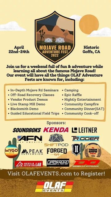 The Mojave Desert Heritage and Cultural Association (501c3 non-profit, a portion of the ticket sales go to MDHCA ) and OLAF Events are partnering to present a premium overlanding event combining historical education, guided field trips exploring the historic Mojave Road and vaunted Eastern Mojave Heritage Trail in Goffs, California. Spring is here and there is no better time to fuel up your vehicle and head for the Mojave desert.