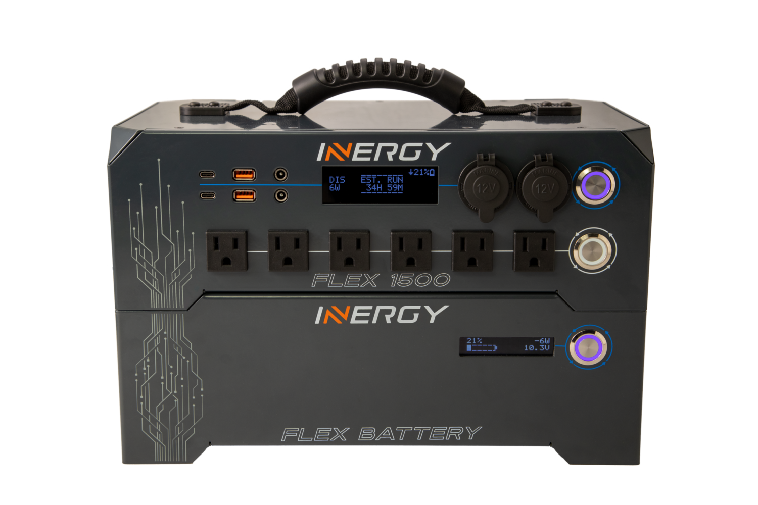 The Flex has a unique, modular, stackable design. The inverter and charge controller are housed in one unit which sits on top of a 1,069-watt-hour lithium-ion battery module. This allows you to easily increase the storage capacity of your power station by stacking multiple batteries below the controller unit, or you can also swap out depleted batteries for fresh ones. The Flex features six AC outlets with a maximum 1,500 watts of continuous AC power output via a pure sine wave inverter. It also has regulated DC power and can handle up to 90 volts of solar input.