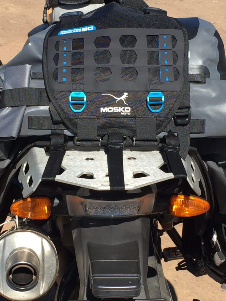Left: Kriega’s nylon platforms provide secure attachment points for their luggage, and are also designed to carry RotoPax containers.