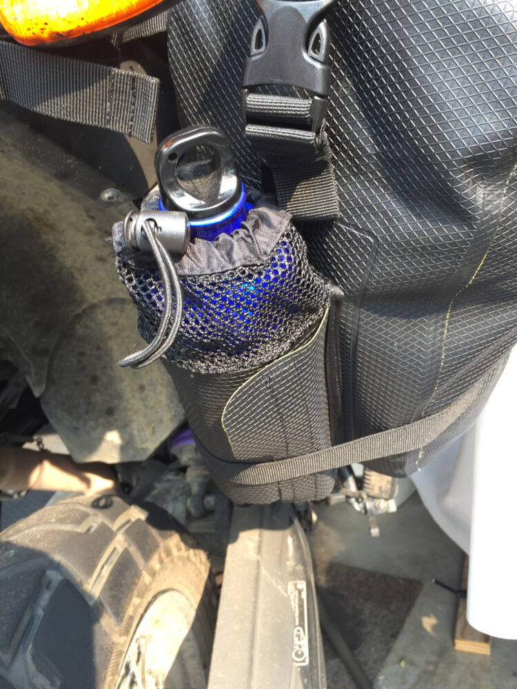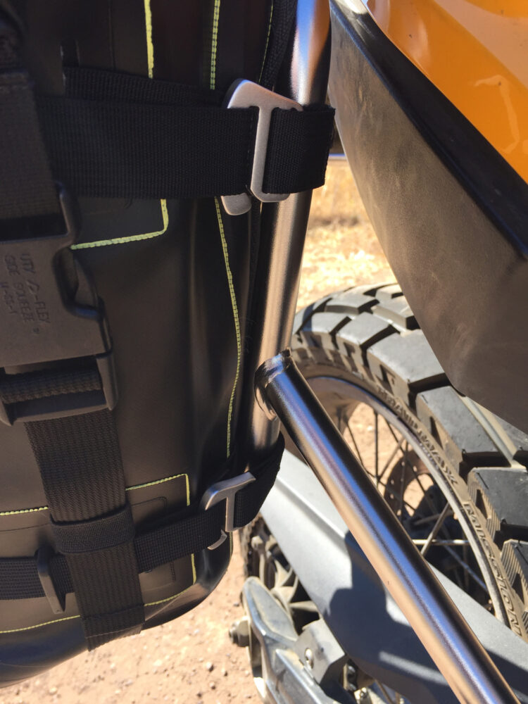 The pair weighs 4.5 pounds and is narrow at 35 inches across my GS. The Extremes mount with long straps and metal buckles at the front, two over-the-seat straps, and an over-the-fender clamping strap connecting the bags at the rear. The rear clamps didn’t fit the bulky GS fender well but did stay in place over challenging roads. Compression straps run back to front over the boot-shaped Extremes to further secure loads, and roll tops with four side-release buckle straps keep them watertight. With very few straps, and the ability to loosen but not release the compression straps, access to the bags is as straightforward as mounting them, and no straps are left dangling. Collapsible pockets on the back of the Extremes hold water or fuel bottles at the ready. Fitment to my GS required a heat shield, which is not included.