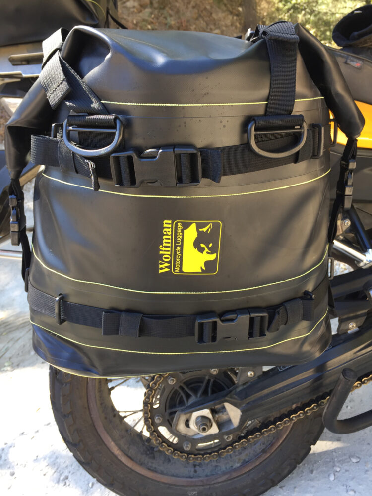 The Expeditions were unnoticeable on the pavement, hugging the motorcycle like they were welded to it, never upsetting the bike through the turns. Miles of rough road failed to budge the gear, and my stash of snacks was just four buckles away. Removing and re-mounting the full Expeditions was more difficult than when empty, but the handles and seat straps made it workable. The Rolie bag stayed put as well, barely noticeable on the top rack. The setup weighs 10 pounds, plus 9 pounds for the rack, and stretches 41 inches across my GS. Wolfman continues to innovate in both material and design, providing an excellent, reasonably priced set of luggage for the adventurer, covered by a 1-year limited warranty.