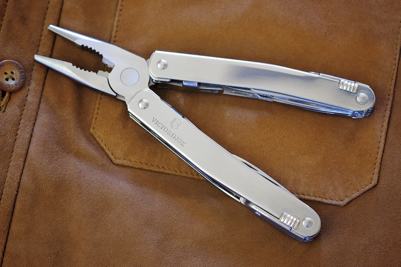 Built around needle-nose pliers with hard and soft wire cutters, the central pivot is machined with exactitude and is impressively smooth. Unfolding the tool around the pliers, it is impossible to not notice how tight and precise the hinges are and that the handles snap into place with a positive click. Within the handle bodies are 10 individual utensils including a file, can and bottle openers, awl, serrated blade, saw, chisel, and four screwdrivers. Like most of the knives and tools offered in the Victorinox line, the Spirit has the brand’s much-loved, razor-sharp scissors. The thoughtful layout of the design allows for each tool to be deployed without first unfolding the handles, and piano key-style locking mechanisms hold each implement securely in place. The lock release is easy to operate, even with gloved hands.