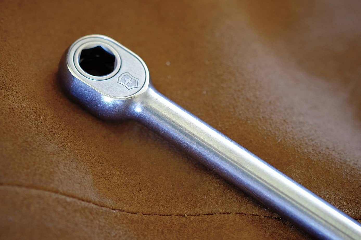 Inside the heavy leather case are additional tools including a corkscrew, jewelry screwdriver, and a miniature ratchet set complete with extension and six hardened steel bits (Torx, Allen, and Phillips). The ratchet is meticulously crafted and has 36 detents allowing it to be effectively used in confined spaces. With the additional accessories, the Spirit can perform 38 functions.