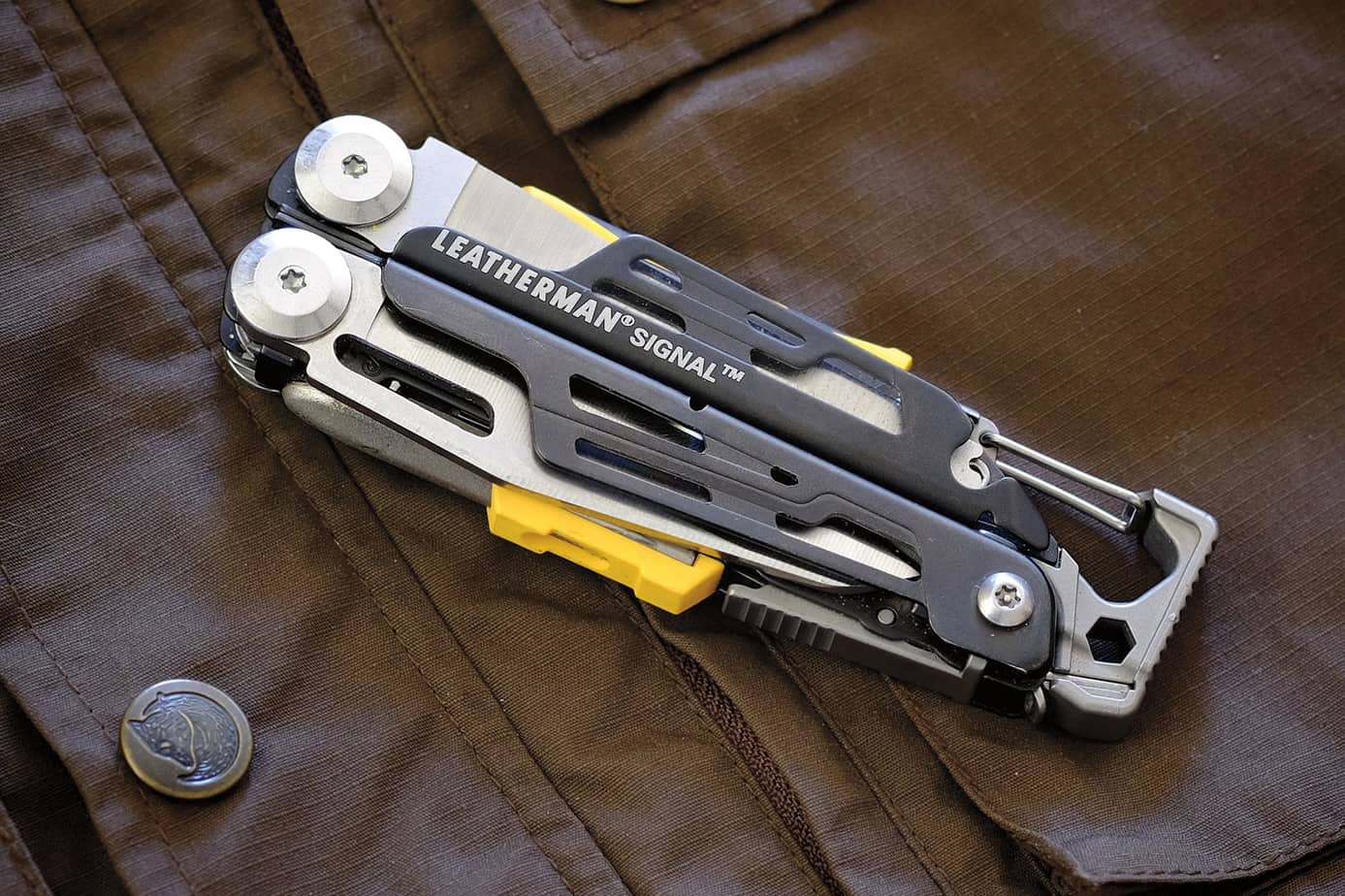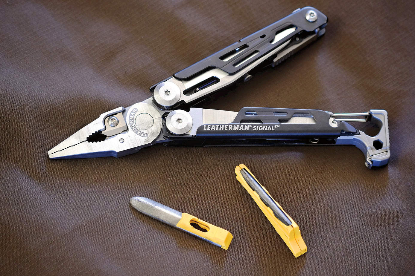 With more than three dozen tools in the Leatherman catalog, the Signal was specifically engineered for the outdoor enthusiast and has a number of features ideally suited to solving any number of backcountry problems. Or more specifically, remote emergencies. Like the Pocket Survival Tool, it is built around needle-nose pliers made of hardened steel. Within those pliers are replaceable wire cutting blades and heavily knurled jaws. At the opposite end is a cast aluminum assembly with an integrated carabiner clip and a blunt striking surface that can be used as a hammer. Inside the handles are five individual foldout tools that include a can/bottle opener, awl, saw, and knife blade made of heat-treated 420 high carbon stainless steel. Both the saw and knife blades are backed with locking mechanisms and can be deployed without opening the main assembly.