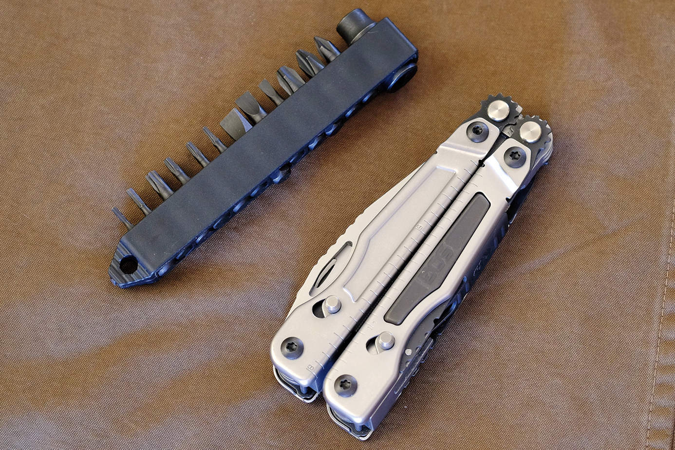Unlike other tools, the implements within the two handles are placed asymmetrically. The straight and serrated blades, screwdrivers, and can and bottle openers are accessed without unfolding the main assembly and lock into position. On the other handle, a saw, file, awl, jewelry screwdriver, and large flat-head screwdriver face inward and can only be unfolded with the tool in the open position. This places the most commonly used functions at the ready and protects the other tools within the handle body. Inside the durable nylon carrying case is a rubberized holder with 13 steel bits (Allen, Phillips, and flat). Taking advantage of the PowerPlay’s main pivot, the bits fit inside a small receiver in the inverted plier assembly and are held fast by the strong bite of the Compound Leverage system.