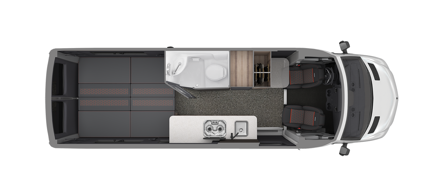 The 24X has gone with a tried and true layout that has been proven in many other campervan builds. It has a curb-side mid-ship galley that extends about halfway in front of the vehicle’s sliding door, leaving ample room for entry and exit.