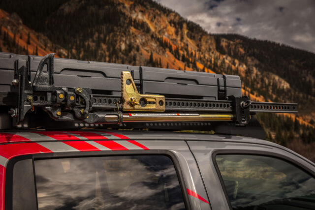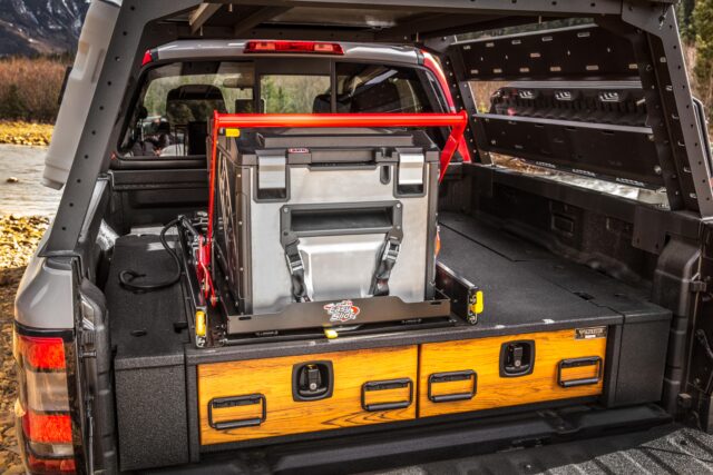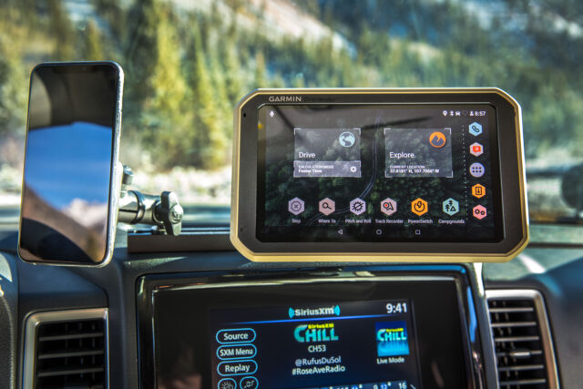 The Project Overland Frontier interior is highlighted by a Garmin Overlander all-terrain GPS system, Garmin PowerSwitch digital switch box for electrical accessory control, and a 67 Designs device mounting system. Finally, special overlanding-specific gear includes a Dometic PLB40 portable lithium battery power source and an Overland Solar Bugout 130 foldable panel.