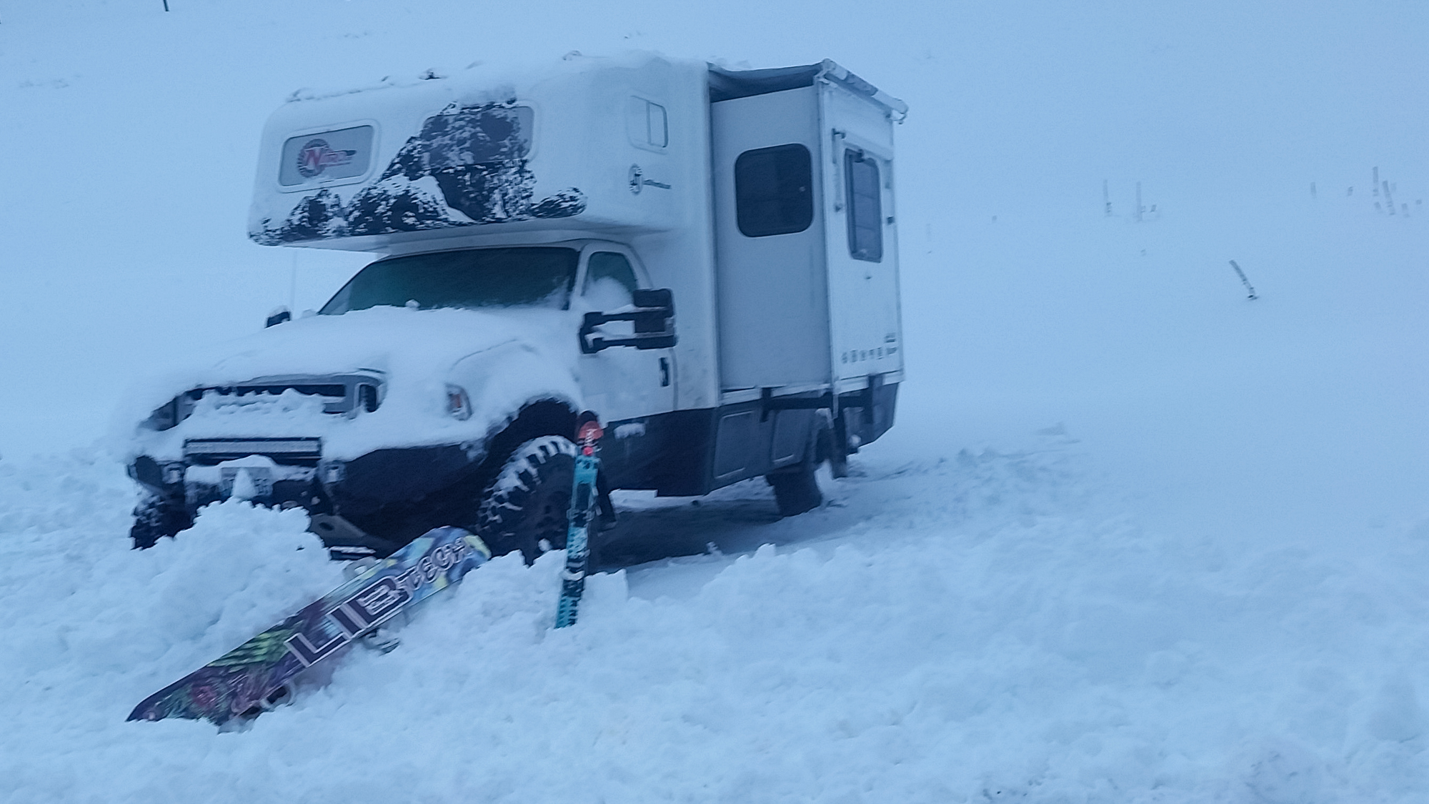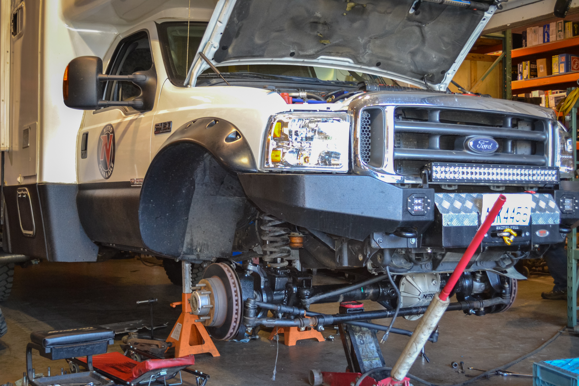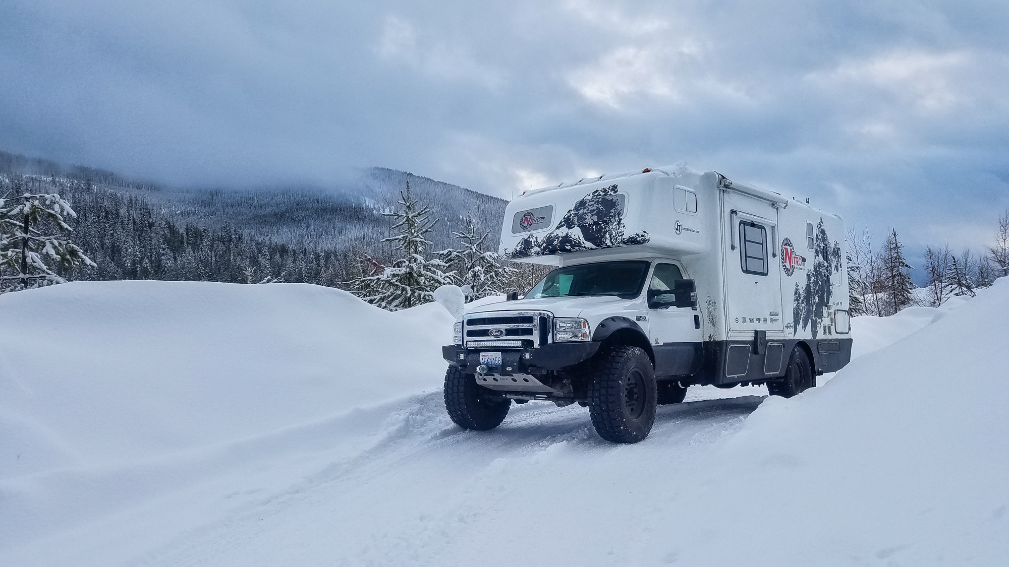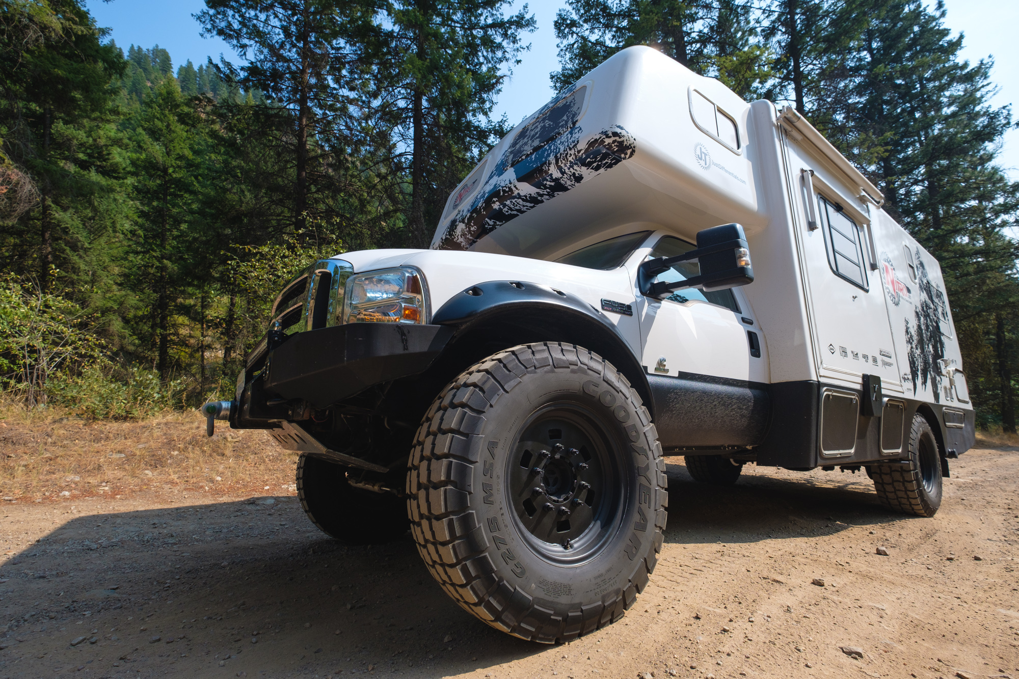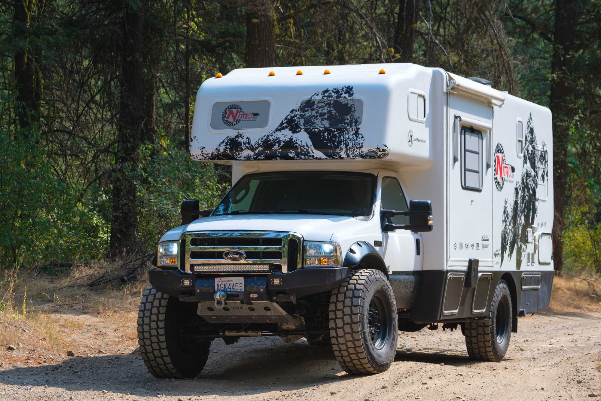 Behind every great build is a purpose, and Nitro Gear’s behemoth is no exception. Carl needed an RV to tow vehicles to shows, serve as a base camp at events, and expand their family’s camping season well into the winter months for skiing and snowboarding. After looking at options of every shape and size, he eventually found what he was searching for: a rather rare coach called the Xplorer Xcurison. This 2004 model is based on a Ford F-450 chassis and powered by the infamous 6.0-liter power-stroke motor. It packs factory four-wheel drive, a Dana 60 up front, Dana S110 in the rear, and three 20-gallon diesel tanks for a 600-mile range. Living appointments include a rear bedroom with queen bed, a queen cabover, a slide-out with kitchenette, a generator, TV, stove, fridge, dual 6V battery setup, and a whopping 100 gallons of freshwater. All of this is tucked inside a one-piece fiberglass shell equipped for true four season camping. For many people, that sounds like an ideal build already, but for Carl, it was simply the beginning. It needed more clearance, more traction, more armor, and more durable components to tackle northern snow storms and reach remote camps.